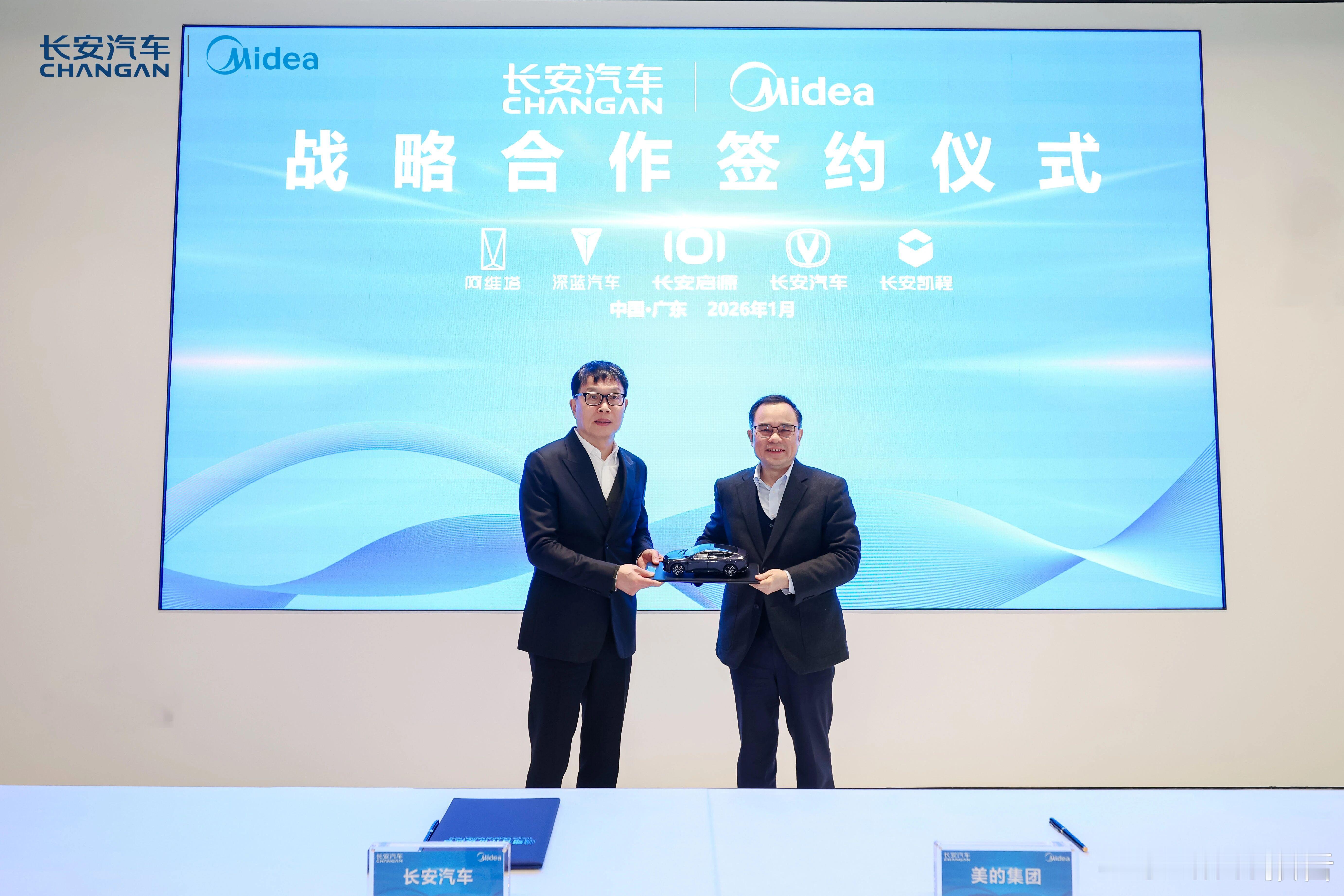 长安汽车与美的集团携手打造“人·车·家”智慧生活1月21日,长安汽车与美的集团在广东佛山美的集团总部举行全面战略合作协议签约仪式。中国长安汽车党委书记、董事长朱华荣与美的集团董事长兼总裁方洪波出席活动并见证签约,长安汽车执行副总裁杨大勇与美的集团企业业务总裁王新亮代表双方签署协议。汽场全开长安汽车美的集团