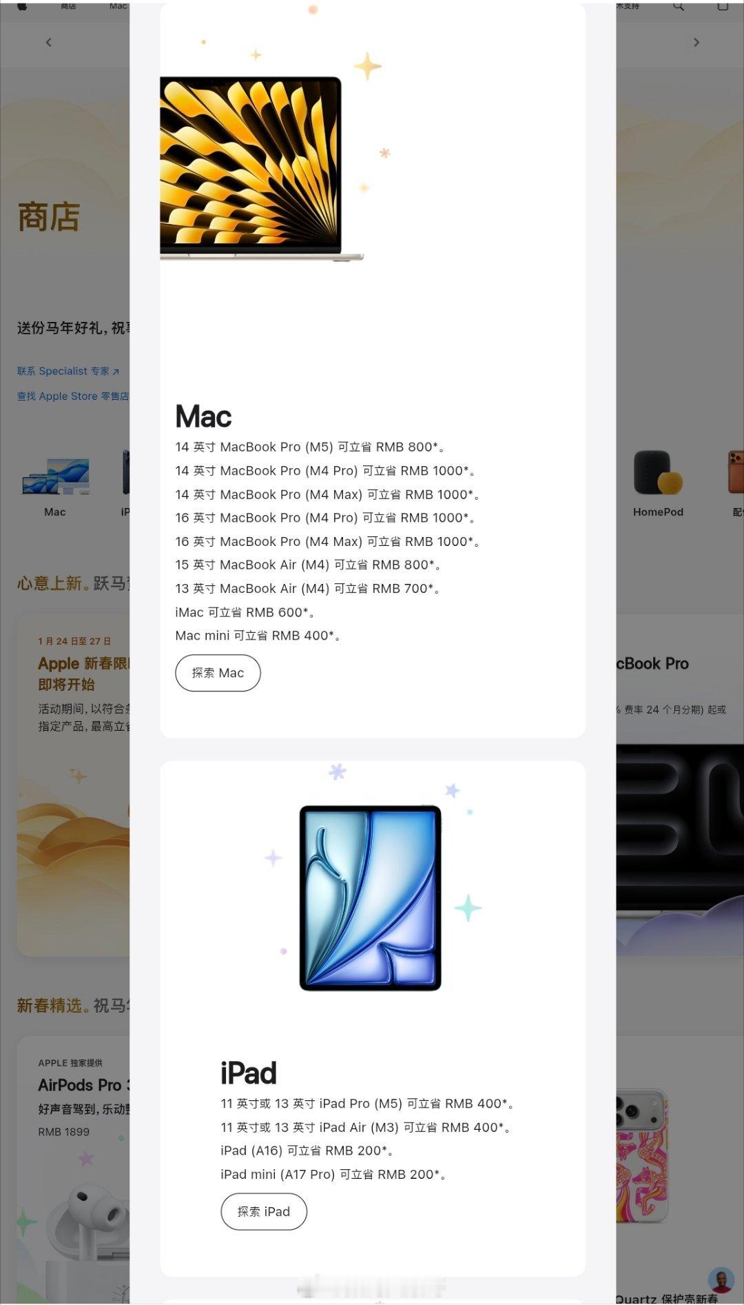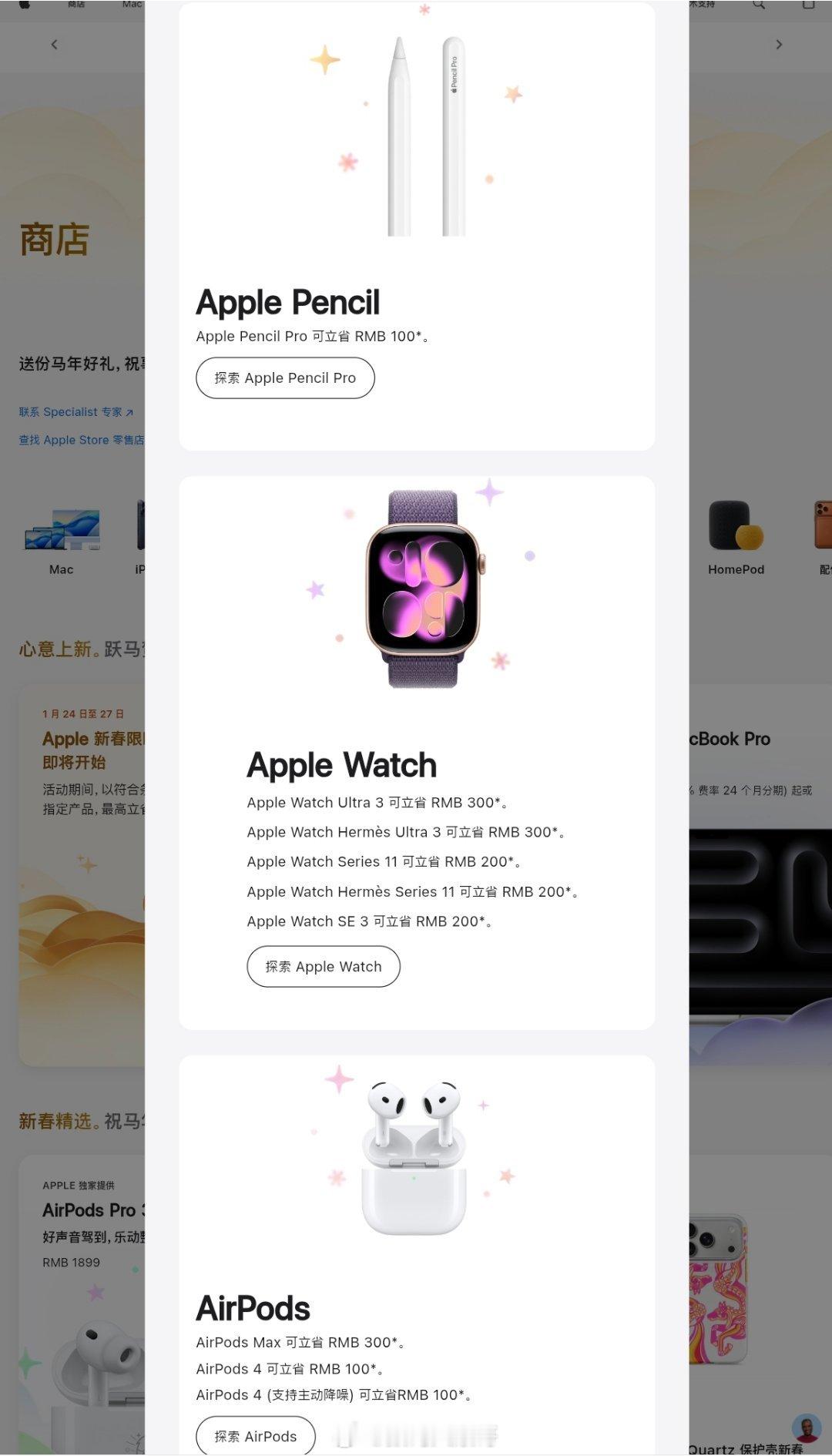 苹果中国官网官宣新春限时优惠活动,1月24日0时1分至1月27日23时59分,以符合条件支付方式购买指定产品,最高立省1000元,覆盖iPhone、Mac、iPad等多款主力产品。苹果限时福利上线苹果官网新春活动