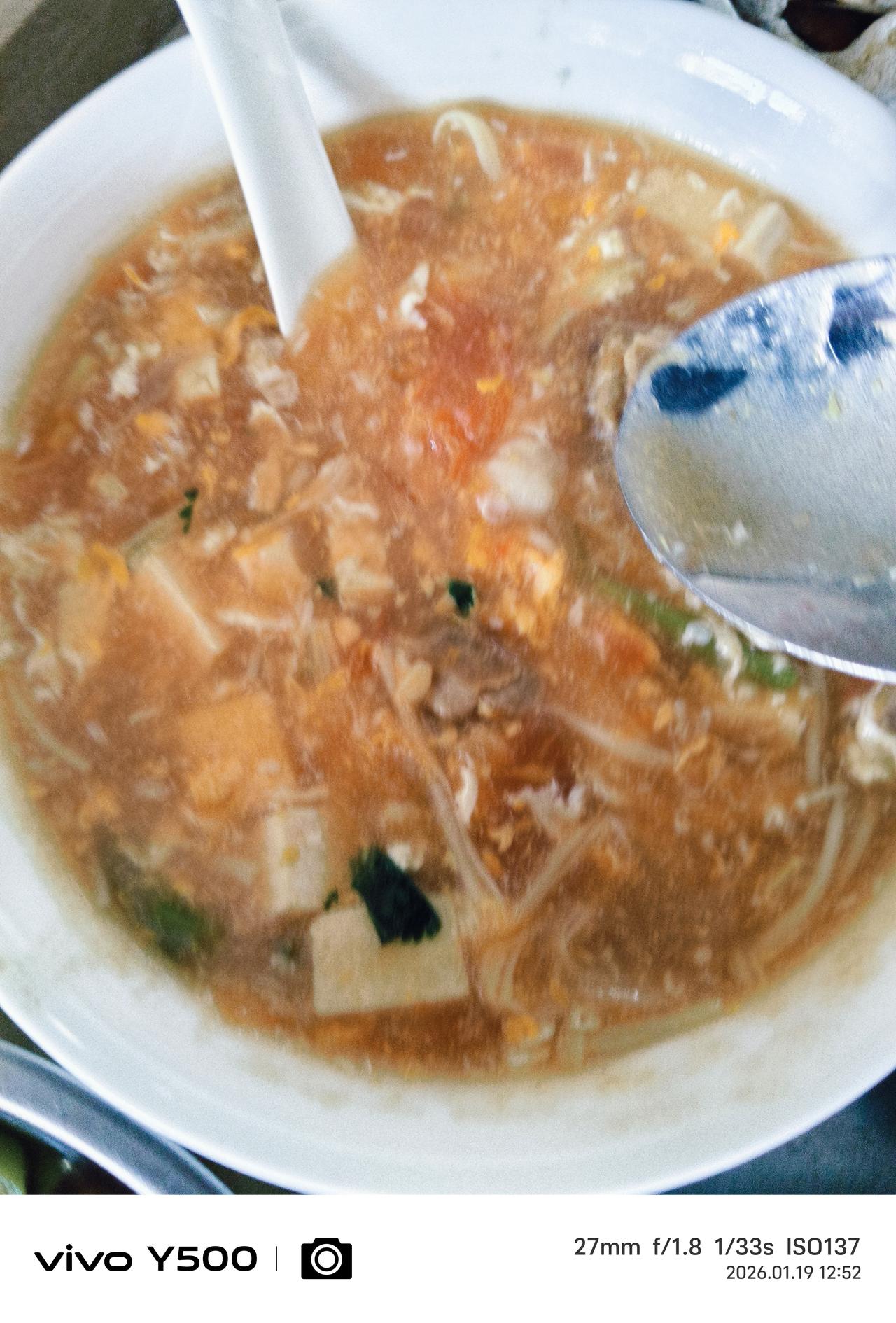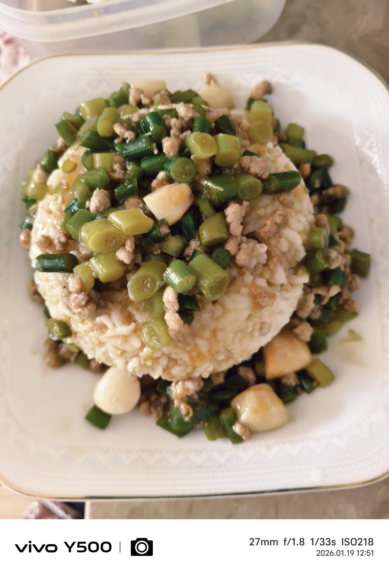 食欲开气血畅精神爽 这几天大连地区的平均温度都是零下十度左右,这是一年中的极端严寒天气,三九和四九冰上走。 大冷的天,总想吃点热气腾腾的食物,不光是食品的温度高还要有温热感,这类食物倒是很多,辣椒太辣、大葱太冲、萝卜胀气、生姜不好搭配,在超市猛然发现蒜毫很亮眼也有温热性是个不错的选择。 怎么烹饪?这个蒜苔炒肉显得干巴巴的,灵机一动,做一个蒜毫肉丁盖饭效果不错。 蒜毫切成丁,肉切成丁淀粉勾芡,盖浇大米饭上多简单。 必须配上一款豆腐蛋花西红柿木耳酸辣汤。煮一盘大虾,炒个青菜土豆丝,这一桌子饭菜赤橙黄绿青蓝紫白五色五味,让你食欲大开气血顺畅微微出汗神清气爽。