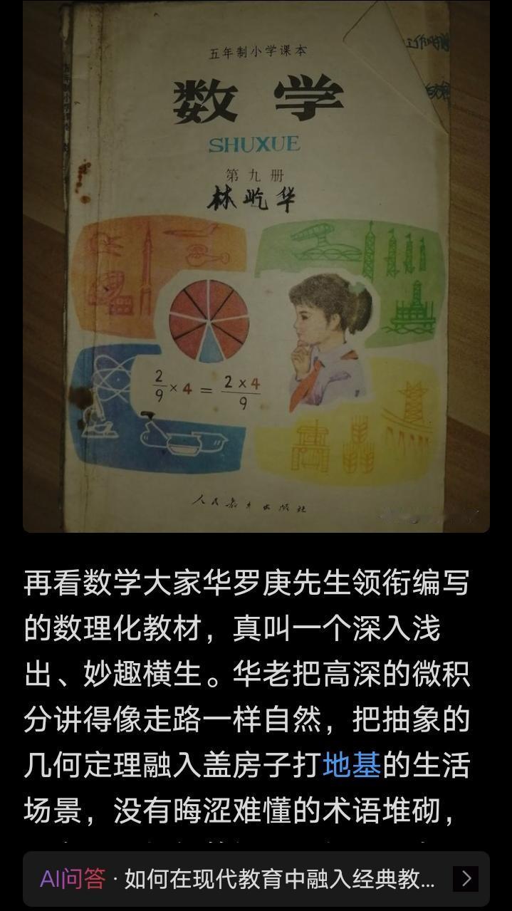 看到有网友呼吁回归叶圣陶、华罗庚编写的经典教材,让教育回归本真。 就想起了,叶圣陶先生当年为了一首小小的儿歌《小小的船》,能反复琢磨二十年。 “弯弯的月儿小小的船,小小的船儿两头尖……”这每一个字,都不是随便写写的。 他写日记说,直到“意极浅显,而情境不枯燥,适于儿童之幻想”,自己才满意。 这是一种什么态度?是把给孩子的东西,当作最精贵的种子来培育。 他主编《开明小学国语课本》时,四百多篇课文,有一半是原创,另一半也是反复打磨的“再创作”,没有一篇是凑数的。 在他眼里,课文不是冷冰冰的知识点陈列柜,而是有温度、有呼吸的文化生命。 他选文章,标准是“具有真见解、真感情、真艺术,不违反现代精神”。 这话听起来简单,做起来却重如千斤。这意味着,教材里的每一个字,都在悄悄塑造一个孩子看世界的眼光和心灵的底色。 再说华罗庚先生,这位世界级的数学大师,可从来没觉得给大学生、中学生写基础教材是“大材小用”。 1958年,他亲自在中国科技大学搞“一条龙教学”,从最基础的讲起,一写就是四卷本的讲义,花了整整八年时间。 你猜怎么着?半个多世纪后,英国剑桥大学出版社愣是看中了这套书的价值,专门找人翻译成英文出版。 外国数学家都承认,这部著作“已经可以列入到经典的书籍当中”。 华老教数学,从来不是教人变成刷题机器。他看重的是“思维的能力”,是那种“从薄到厚”再“从厚到薄”的读书功夫。 他相信,数学教育不只是为了培养几个数学家,更是“提高一个民族的科学和文化素质”的基石。 他的教材里,不仅有公式定理,更有一套完整的、活生生的思维体操。 回头看看我们现在有些孩子的书包。那真是沉甸甸的。里面塞满了各种“神器”:考点速记、真题汇编、解题大招……教材本身,反而像是个若有若无的引子。 语文课,课文成了提取答题技巧的“矿场”;数学课,公式成了攻克压轴题的“弹药”。 叶圣陶先生早就说过,“语文教材无非是例子”。但很多人把这话理解歪了,觉得“例子”嘛,随便换一个也行,不重要。错了!大错特错!叶老说的“例子”,那是精挑细选、蕴含无穷奥妙的“典范”。 就像学书法,你得临摹颜真卿、王羲之的原帖,不能总盯着那些江湖体字帖学。 教材这个“例子”,是承载语言规律、思维方法和人文精神的唯一母体,丢了它,语文的魂就散了。 你说,这是孩子的错吗?是老师的错吗?恐怕都不是。 这更像是一个系统在高速运行中产生的“跑偏”。 当“唯分数、唯升学”成为挥之不去的指挥棒,当“一味刷题、补课太多”成为普遍被诟病却又难以挣脱的泥潭,最受伤的,恰恰是教育“育人”的那个核心功能。 教材,这个本应最丰富、最深厚的文化土壤,在功利化的洪流下,有被简化为“考点地图”的风险。 说到底,网友呼吁回归叶圣陶、华罗庚编教材的精神,不是在搞复古,也不是说要把几十年前的课本原封不动搬回来。 他们呼唤的,是那种“编书育人”的初心和匠心。那是一种把学生当成“完整的人”来培养的敬畏感。 叶圣陶先生提出“教是为了达到不需要教”。 教育的最高目标,是点燃学生内心那把求知的火,然后放手让他自己奔跑。 老师就像教孩子走路的父母,开始要扶着、领着,最终是为了他能独立行走,甚至去探索你都没去过的远方。 华罗庚等数学家们强调,数学要夯实“双基”(基础知识和基本技能),但更要发展思维和能力。 他们编写教材,字里行间透着的,就是一种引领思维登高望远的格局。 这种经典教材的“魂”,它告诉我们,一本好教材,应该像一幅精心绘制的地图,它不仅要标出知识点在哪里,更要展示知识背后的山川河流、风土人情,激发探险者(学生)自己前往探索的欲望。 它应该是“文化载体”,让孩子在《吃水不忘挖井人》这样的课文修改中,体会语言文字的音韵之美和情感之真;也应该是“思维引导者”,像华罗庚的“一条龙”教材那样,把复杂的理论脉络清晰地展现出来,引导学生体会“学而要用,用而要创”的乐趣。 所以,全网这份“回归”的呼声,它不是在怀旧,而是在眺望未来。它是在焦虑之中,寻找一个可以锚定的坐标。 叶圣陶、华罗庚他们编写的教材,以及背后那种精益求精、育人为本的理念,就是这样一个坐标。它提醒我们,无论技术如何革新,形式如何变化,教育的本质从未改变——那就是用人类最优秀的文化结晶,去启迪智慧,涵养人格,点燃梦想。 十年树木,百年树人。教材,就是最初的那捧土,那泓泉。把这捧土弄扎实了,把这泓泉引清澈了,小树苗才能长得正、扎得深,未来才有可能成为顶天立地的栋梁。 参考:汪瑞林:正确理解叶圣陶的三个思想观点——中国教育报