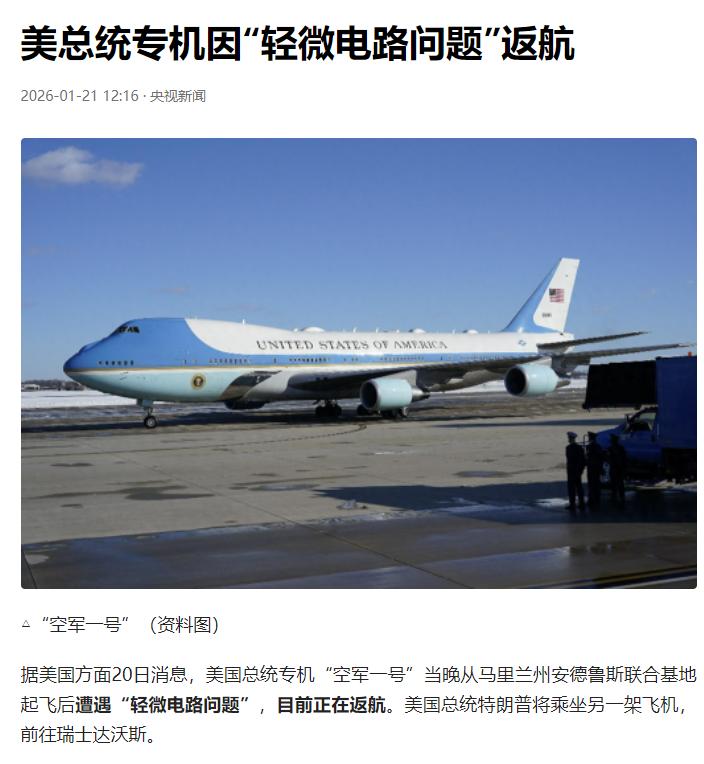 白宫传来消息! 2026年1月21日,白宫宣布美国总统专机“空军一号”在起飞后因遭遇“轻微电路问题”被迫返航,美国总统特朗普将换乘另一架飞机继续前往瑞士达沃斯参加世界经济论坛。 白宫说这是“轻微电路问题”,但随团记者提到新闻舱灯光突然熄灭的细节,让人心照不宣。就像美国反复强调的“印太战略”,表面喊着“自由开放”,实际处处是短路的算计。 过去五年,特朗普政府把60%的新增防务预算砸向亚太,却在2025年被中国反制关税打得国内通胀爆表,加州码头工人罢工、中西部农民抗议,连波音的新“空军一号”都因供应链断裂推迟交付,这架老飞机的故障,何尝不是美国全球部署超负荷的缩影? 更值得玩味的是特朗普此行的目的地达沃斯。这个曾被美国视为“全球治理客厅”的论坛,如今成了特朗普的“筹款会”。2025年他强推“对等关税”,逼着日韩沙等国承诺万亿投资,表面是“美国优先”的胜利,实则是战略收缩的遮羞布。 当欧洲盟友在俄乌问题上要求美国增兵,中东王爷们抱怨“保护费”太高,特朗普只能把西半球当成最后的自留地,2025年派兵委内瑞拉、强改墨西哥贸易条款,这些被戏称“唐罗主义”的操作,本质是美国在全球力不从心后,退守家门口的困兽之斗。 这种收缩在台海问题上尤为明显。2025年美国对台军售破百亿,却在解放军环台军演时,连航母战斗群都不敢靠近巴士海峡。不是不想干涉,而是真没余力,2025年美国海军30%的驱逐舰超期服役,太平洋舰队因维修经费不足,每月只能派两艘军舰穿越台海。 更讽刺的是,特朗普威胁“动武就加征200%关税”,结果2026年1月关税真到了临界点,美国农业部却紧急求购中国脐橙缓解民生压力,这种“一边挥拳头一边讨饭吃”的样子,让台湾岛内看在眼里。 岛内民调显示,2025年认同“两岸同属一中”的比例涨到68%,比关税战前高了12个百分点。道理很简单:当美国在贸易战中露出纸老虎本质,台湾民众发现所谓“保护伞”连自家飞机都修不好。2025年台湾凤梨输陆受阻,大陆转头采购菲律宾产品,民进党当局急得跳脚,美国却忙着和越南签菠萝进口协议,这种“弃台保商”的操作,让高雄果农直言:“美国人只会卖武器赚钱,哪管我们死活?” 更深层的变化在产业链,2025年中国对镓锗等关键矿产实施出口管制,台湾积电厂房的扩产计划直接卡壳,而美国承诺的“芯片补贴”迟迟不到位。相反,福建平潭的物流园里,台湾货车直通大陆高速网,2025年京台高速福建段通车,让台北到福州的物流时间从4小时缩到90分钟。这种“大陆供血、美国抽血”的对比,让台中商人林先生感叹:“美国人画的饼会过期,大陆修的路是真的。” 特朗普或许没算到,他的关税大棒反而敲醒了台湾的“经济台独梦”。2025年台湾对大陆贸易顺差突破1800亿美元,占GDP的12%,当美国加征关税导致台企利润缩水,大陆却连续三年扩大台湾农渔产品进口。 高雄港的数据最说明问题:2025年下半年,驶向厦门的货轮比赴美航线多了三成,船上装的不是芯片,而是台东的释迦、澎湖的紫菜,这些曾经被民进党视为“台独经济”支柱的产品,如今成了两岸血脉相连的注脚。 回到“空军一号”故障事件,最耐人寻味的是波音的反应。这家百年老店把延误归咎于“供应链重组”,却不敢提2025年因中国反制关税,其在华订单减少40%。就像美国的台海政策,嘴上喊着“协防”,身体却诚实,2025年12月批准对台军售当天,五角大楼悄悄取消了原定的航母穿越台海计划。这种色厉内荏,让台湾退役将领宋炯明直言:“美国人连总统座机都修不好,还能保护谁?” 2026年的台海,早已不是2016年的台海。当大陆的052E驱逐舰开始在南海常态化巡航,当福建的“小三通”变成“大三通”,当台湾青年在大陆短视频平台分享生活成为常态,任何外力都无法逆转两岸融合的大势。特朗普的专机可以返航,美国的霸权战车却已刹不住车——在全球180多个国家中,172个坚持一个中国原则,这个数字,比“空军一号”的机龄更有说服力。