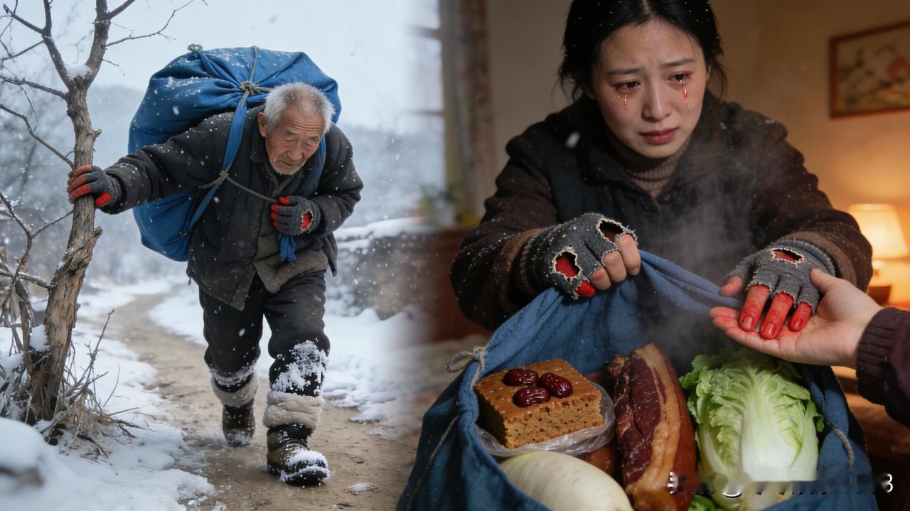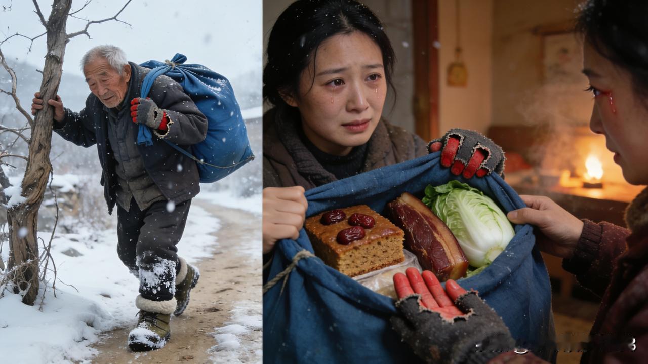 “爸!外面冷,快进来!” 女儿冲出去接过布包,老人却笑着拍掉她手上的雪:“你爱吃的都在这儿,萝卜腌透了、枣糕不粘牙。” 布包里的土产沉甸甸的,女儿突然发现父亲的手套破了个洞,指尖冻得通红。