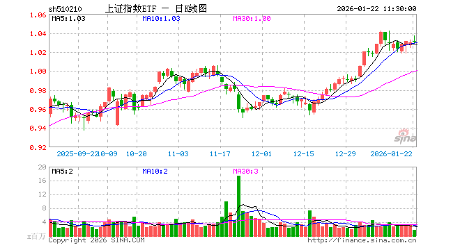 1月22日,截止午间收盘,上证指数ETF(510210)涨0.10%,报1.031元,成交额1.69亿元。上证指数ETF(510210)重仓股方面,农业银行截止午盘跌2.16%,贵州茅台跌0.30%,中国石油涨1.30%,工业富联跌0.58%,恒瑞医药跌1.21%,三一重工跌0.31%,紫金矿业跌2.31%,中国银行跌0.38%,招商银行跌0.94%,邮储银行涨0.00%。