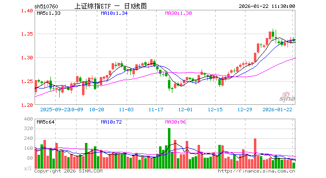 1月22日,截止午间收盘,上证综指ETF(510760)跌0.22%,报1.334元,成交额5675.79万元。上证综指ETF(510760)重仓股方面,农业银行截止午盘跌2.16%,工商银行跌0.95%,贵州茅台跌0.30%,中国石油涨1.30%,招商银行跌0.94%,工业富联跌0.58%,中国人寿跌1.09%,寒武纪跌0.24%,中国银行跌0.38%,中国平安跌1.47%。