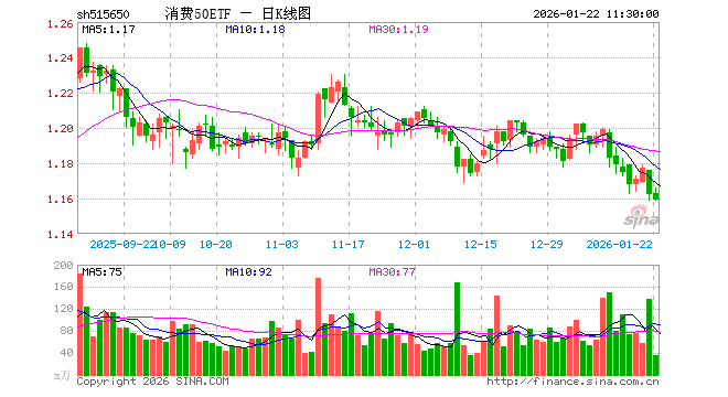 1月22日,截止午间收盘,消费50ETF(515650)跌0.26%,报1.159元,成交额4023.87万元。消费50ETF(515650)重仓股方面,贵州茅台截止午盘跌0.30%,美的集团跌0.03%,五粮液跌0.03%,格力电器涨0.17%,伊利股份跌0.22%,牧原股份跌1.45%,三花智控跌2.73%,温氏股份跌0.13%,海尔智家跌0.23%,山西汾酒跌0.59%。