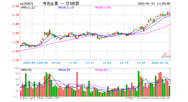 1月22日,截止午间收盘,有色金属ETF(159871)跌1.37%,报2.237元,成交额8055.48万元。有色金属ETF(159871)重仓股方面,紫金矿业截止午盘跌2.31%,洛阳钼业跌2.50%,北方稀土跌0.02%,华友钴业跌1.67%,中国铝业跌1.04%,赣锋锂业跌0.33%,山东黄金跌4.12%,云铝股份跌0.79%,中金黄金跌3.78%,中矿资源跌0.09%。