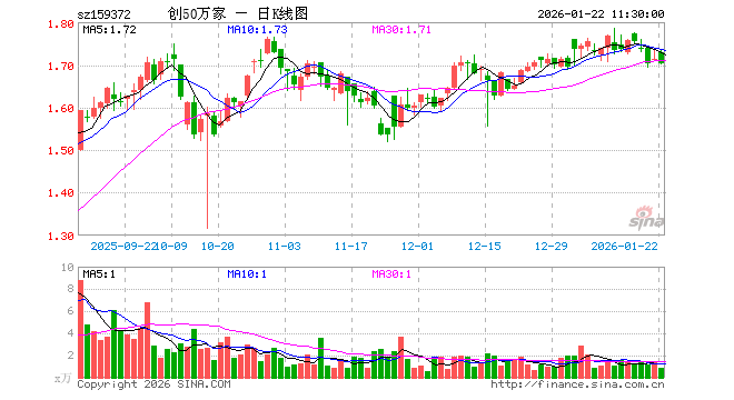 1月22日,截止午间收盘,创业板50ETF万家(159372)跌0.53%,报1.703元,成交额146.96万元。创业板50ETF万家(159372)重仓股方面,宁德时代截止午盘跌2.80%,中际旭创涨1.11%,新易盛跌0.14%,东方财富跌0.13%,阳光电源跌1.16%,胜宏科技涨1.84%,汇川技术跌1.04%,迈瑞医疗跌0.79%,天孚通信涨2.95%,亿纬锂能跌2.99%。
