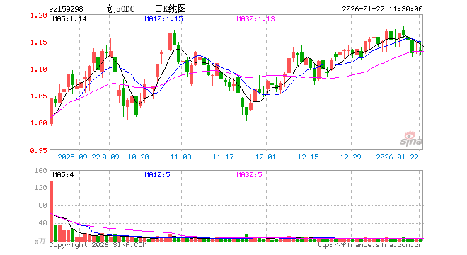 1月22日,截止午间收盘,创业板50ETF大成(159298)跌0.09%,报1.130元,成交额277.79万元。创业板50ETF大成(159298)重仓股方面,宁德时代截止午盘跌2.80%,东方财富跌0.13%,新易盛跌0.14%,中际旭创涨1.11%,胜宏科技涨1.84%,汇川技术跌1.04%,阳光电源跌1.16%,迈瑞医疗跌0.79%,天孚通信涨2.95%,同花顺跌0.61%。