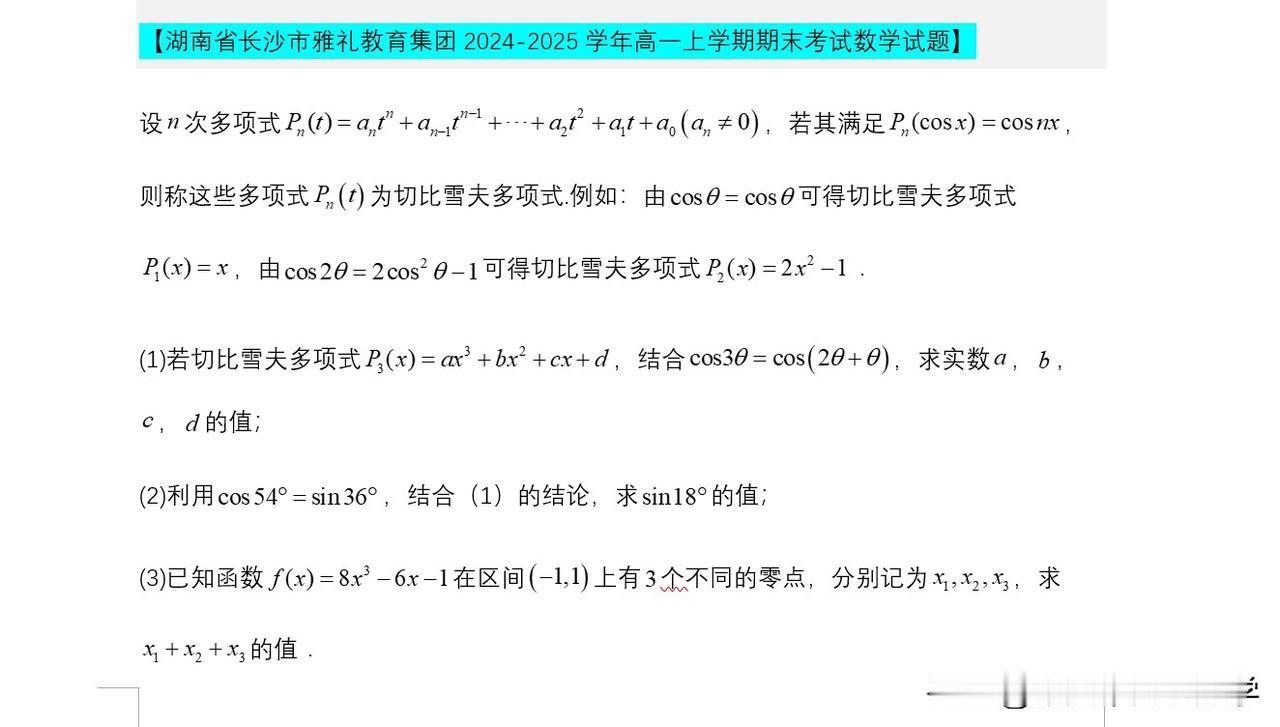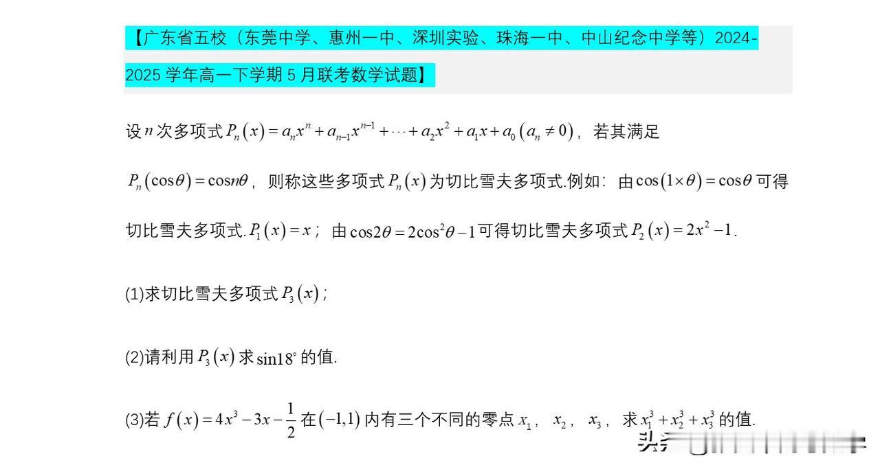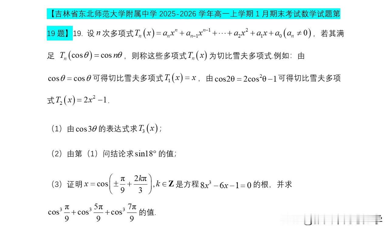 切比雪夫多项式问题,启动创新班期中考试考过,吉林师大这次期末考试考过。去年杭州二中、长沙雅礼这些名校都考了。在我记忆里面常州有一年直接考查三倍角公式。其实原理都在这个多项式中。 本次期末考试还有其他名校会考吗?期待 方法点睛:“新定义”主要是指即时定义新概念、新公式、新定理、新法则、新运算五种,然后根据此新定义去解决问题,有时还需要用类比的方法去理解新的定义,这样有助于对新定义的透彻理解.但是,透过现象看本质,它们考查的还是基础数学知识,所以说“新题”不一定是“难题”,掌握好三基,以不变应万变才是制胜法宝.