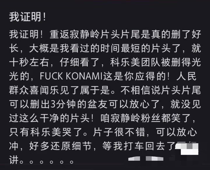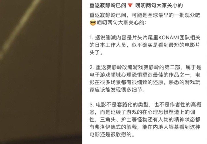 重返寂静岭中外网友对比片头时长 内地公映的《重返寂静岭》,其片头时长经对比确认短于海外版。删减内容主要为片头列表信息。影片的叙事主体和氛围营造据说未被波及。对于想在大银幕感受这一经典IP的观众,明天上映值得关注。