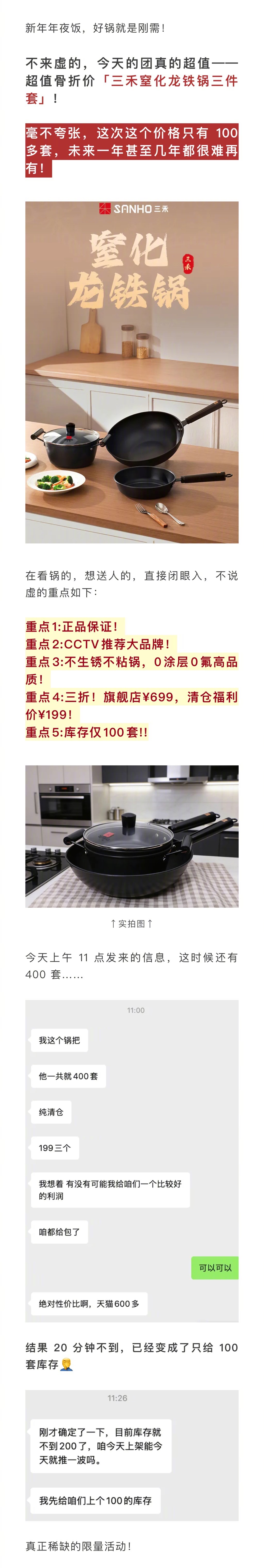 准备年夜饭没有个好用的锅怎么行,今天安排一个特别超值的三禾窒化铁锅三件套的团,捡漏价先到先得!三件套包括炒锅+汤锅+煎锅,专利窒化技术,不用开锅,0涂层不粘不生锈不怕划,直接铁铲钢丝球招呼,一点都不娇气,特好用!原价大几百,开团价一套只要199,拿到的库存不多,有需要的宝子放心入