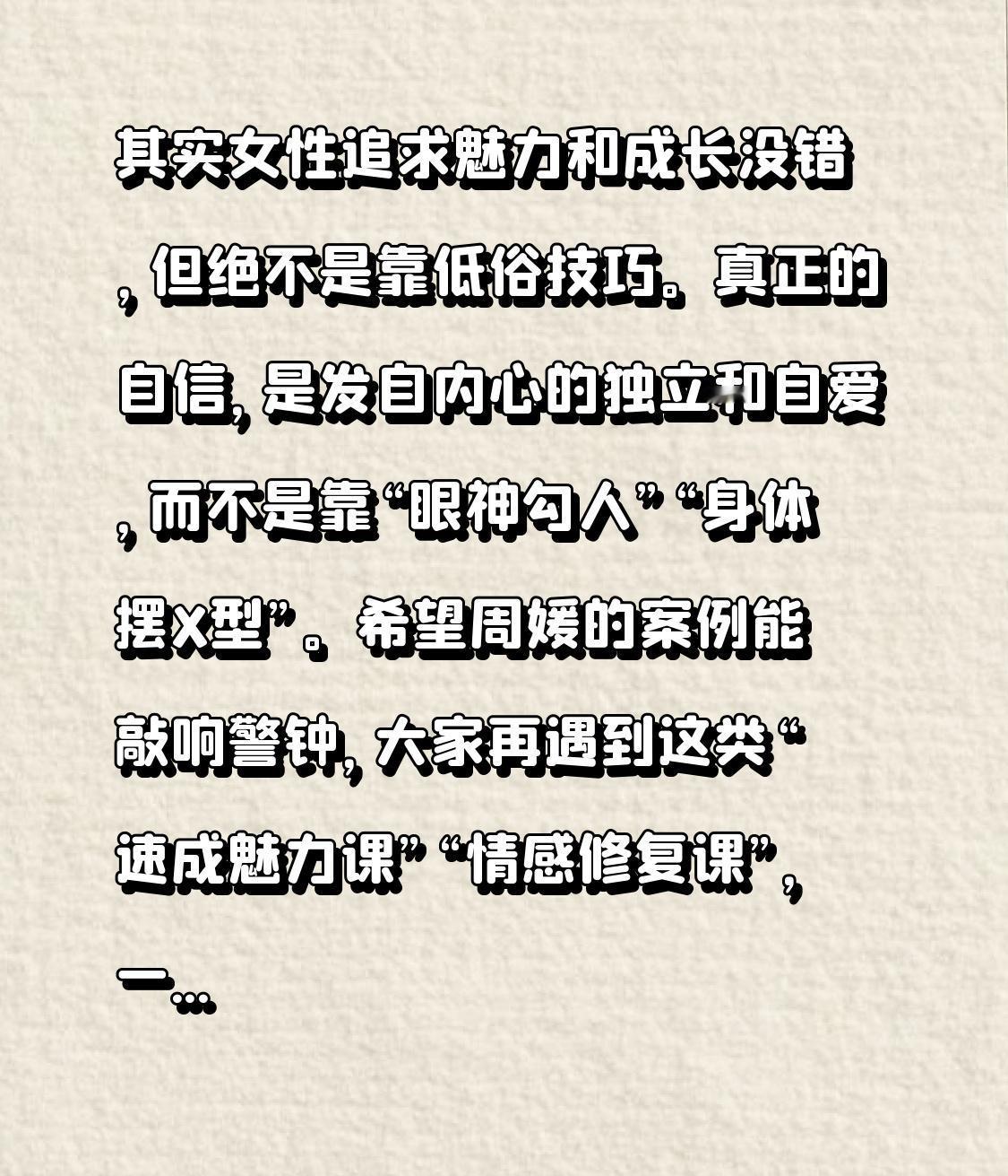 疯狂!“眼神给出去”周媛,性商课狂赚2400万,8.8万天价课竟藏惊天骗局? 家人们最近刷到那个魔性视频了吗?“我只眼神给出去,身体形成X字形”,45+的周媛靠着浮夸的肢体动作、洗脑的台词爆火全网,网友们一边模仿调侃“灵不灵动我不知道,巴掌很想动”,一边惊掉下巴——她的“性商课”居然狂赚2400万,最高单节课卖到8.8万! 谁能想到,这场全网玩梗的背后,是一个庞大的收割帝国。周媛自称“中国性商教母”,开了家“黑白颠性商学苑”,课程价格从9.9元的体验课到8.8万的高阶研习班,梯度分得明明白白。线上999元的“全维提升营”有5690人报名,线下2999元两天两夜、4980元三天三夜的训练营,一个月开10多场还得提前10天预约,长沙、厦门、西安等多地都有分点,累计学员超10万人。 本以为是普通的女性魅力课,没想到深挖下去全是反转!首先是课程内容,表面包装成“取悦自己”,内核全是擦边球:教“眼神勾人”“余光传暧昧”,甚至包含“丝袜诱惑”“浴室玩法”等露骨内容,被网友怒怼“这不就是小三培训班”。更离谱的是定价,8.8万的“全维成长研习班”,居然还捆绑“财富聚能”“30%课程分润”,说白了就是拉学员当下线,搞传销式收割。 更让人震惊的是资质造假!机构宣称导师有“国家认证心理咨询师”资质,可懂行的都知道,这个证书2017年就取消了,纯属无稽之谈。而且她商城里的情趣用品,同款润滑剂卖109元,比其他平台贵了一倍多,借着课程流量疯狂溢价割韭菜。有学员花大价钱学完实操,不仅没修复亲密关系,反而被丈夫嫌弃,好好的婚姻雪上加霜。 可为啥还有上万人买单?说白了就是拿捏了女性的情感焦虑。来上课的大多是遭遇婚姻危机、自我怀疑的女性,周媛打着“女性成长”“掌控亲密关系”的旗号画大饼,让她们以为学几套媚术就能改变命运。但真正的亲密关系靠的是尊重和沟通,不是靠讨好迎合,这些课程反而把女性困在“取悦男性”的枷锁里,根本不是什么赋能。 现在反转又来了!周媛的抖音账号已经被限制关注,多个平台改成私密状态,眼看要凉。更关键的是,2026年2月《直播电商监督管理办法》就要施行,这种打擦边球、违反公序良俗的课程,大概率要被直接叫停。那些花8.8万上课的学员,恐怕要血本无归。 其实女性追求魅力和成长没错,但绝不是靠低俗技巧。真正的自信,是发自内心的独立和自爱,而不是靠“眼神勾人”“身体摆X型”。希望周媛的案例能敲响警钟,大家再遇到这类“速成魅力课”“情感修复课”,一定要擦亮眼睛,别被焦虑裹挟,花了冤枉钱还被带偏价值观。 你觉得这种“性商课”是赋能女性还是收割韭菜?遇到情感问题你会花钱买这类课程吗?评论区聊聊你的看法,别忘了点赞转发,提醒身边的女性朋友:真正的成长,从来不需要靠讨好别人!