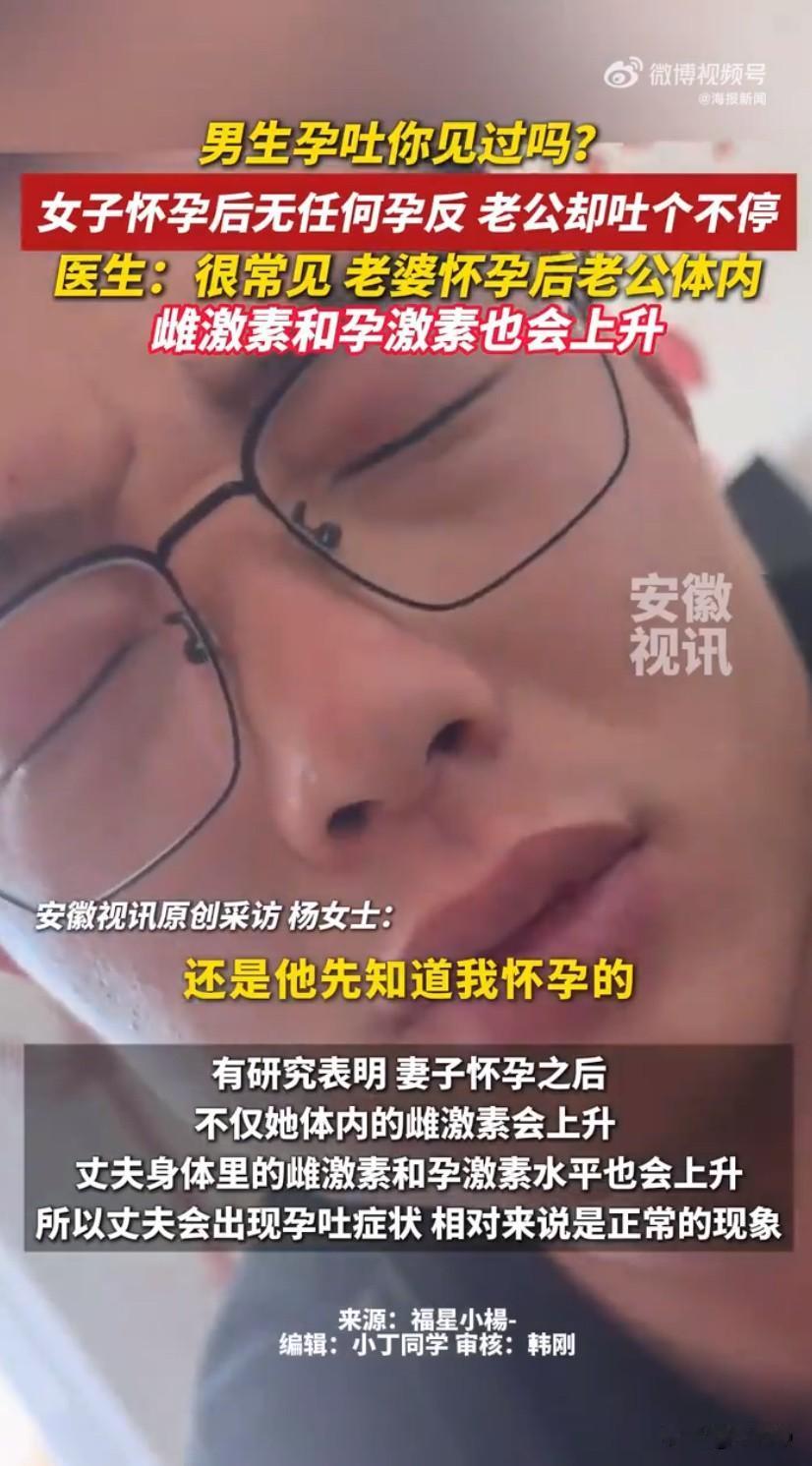 妻子怀孕全程零孕反,老公反倒吐到怀疑人生,医生一句话解开大伙疑惑! 山西杨女士的怀孕经历可太有意思了,别人怀孕都是孕妈吐到天昏地暗,她倒好,怀上身孕后该吃吃该喝喝,一点孕吐恶心的感觉都没有,反倒是她老公,成了家里孕吐最严重的那位,这波操作直接看懵了一众网友。据杨女士说,就在她怀孕大概两个月的时候,神奇的事儿就发生了,她自己没啥异样,老公却突然开启了疯狂孕吐模式,动不动就恶心反胃,闻不得一点油烟味,有时候看到别人吃重口味的东西,他都得赶紧躲远,吐得那叫一个撕心裂肺。更离谱的是,当初还是她老公先察觉到不对劲,总觉得身体不得劲,念叨着可能是怀孕了,俩人一测才发现,原来是杨女士真的怀上了,这剧情简直比电视剧还抓马。 这事一出直接火出圈,网友们都笑翻了,纷纷调侃这才是真正的“感同身受”,还有人打趣说这是夫妻间最高级的共情,别人怀孕是两个人期待,这对夫妻是两个人“遭罪”,分工明确到离谱,一个负责怀,一个负责吐。也有不少过来人宝妈留言,说自家老公当年也有过类似操作,只不过没这么严重,看来这种事儿还真不是个例,不是男人矫情,是真真切切的身体反应。 大家好奇归好奇,也都纳闷,好好的大老爷们儿,为啥老婆怀孕他会跟着孕吐?别急,医生很快就给出了专业解读,解开了大家的疑惑。医生说,这种情况看着稀奇,其实是正常现象,并不是老公装出来的。因为在老婆怀孕之后,朝夕相处的准爸爸体内的雌激素和孕激素会跟着出现上升趋势,激素水平一波动,身体就会做出相应反应,孕吐就是最常见的一种,这在医学上还有个说法叫妊娠伴随综合征,说白了就是准爸爸用身体在陪孕妈一起经历孕期,是很暖心的一种生理联动。 其实不光是孕吐,有些准爸爸还会跟着孕妈出现嗜睡、乏力、情绪波动大的情况,都是激素变化和心理共情的双重作用。毕竟马上要当爸爸了,心里又期待又焦虑,再加上心疼老婆怀孕辛苦,不知不觉就会和老婆的身体状态产生同频。不得不说,这种神奇的反应真的很暖心,它让准爸爸不再是孕期的旁观者,而是实打实的参与者,也让大家感受到,孕育一个新生命从来都不是孕妈一个人的事,而是一个家庭双向奔赴的幸福旅程。现在杨女士的老公虽然吐得难受,但心里满是期待,每天一边吐一边乐呵呵地给老婆准备各种营养餐,妥妥的宠妻狂魔一枚,这样的神仙夫妻日常,也让不少网友直呼羡慕。孕吐 妻子怀孕丈夫却孕吐不停 医生解读妻子怀孕丈夫孕吐不止 来源:安徽视讯