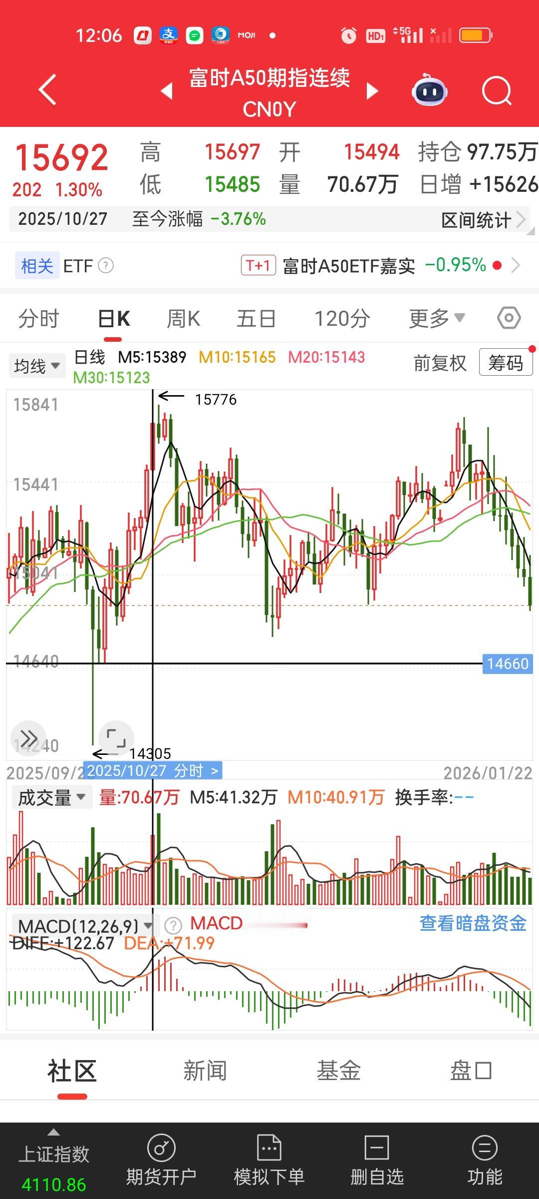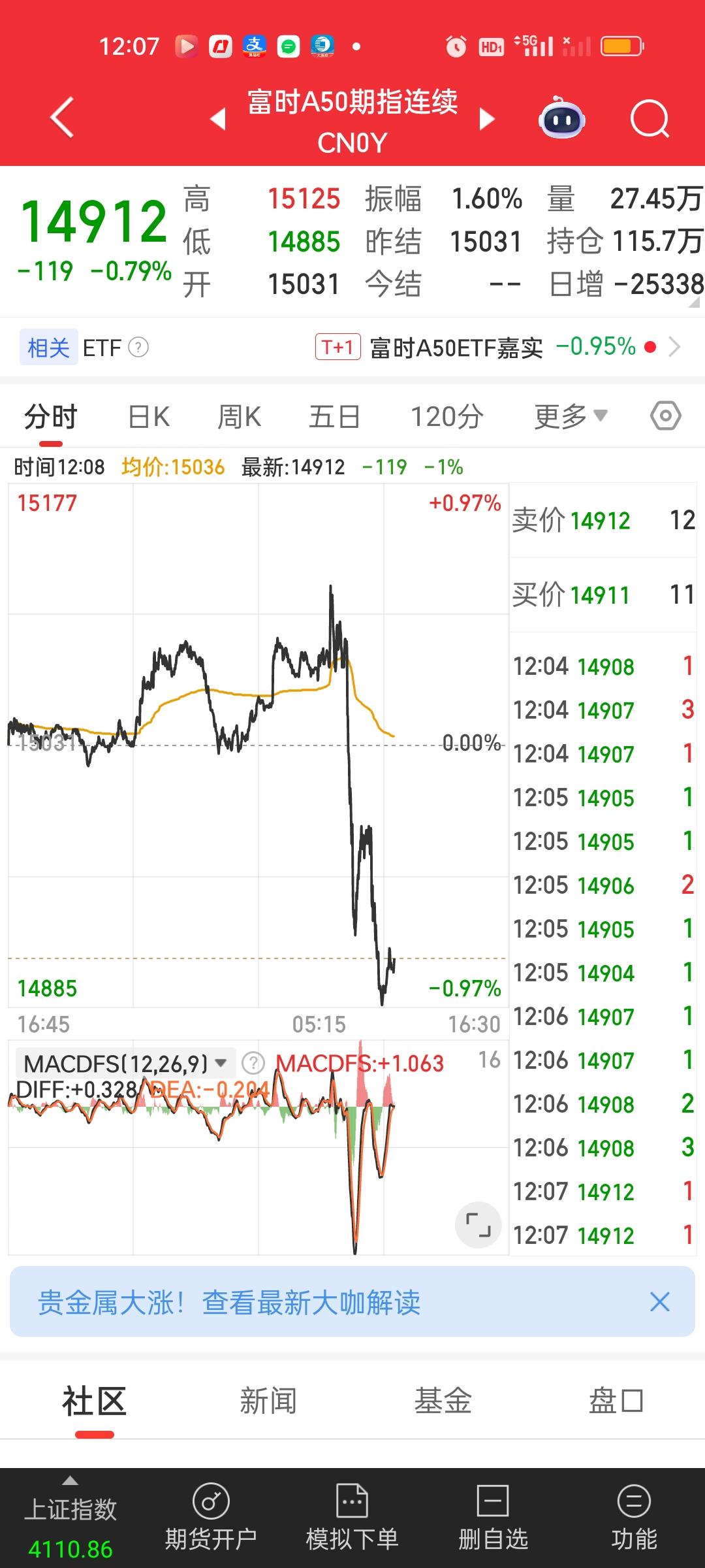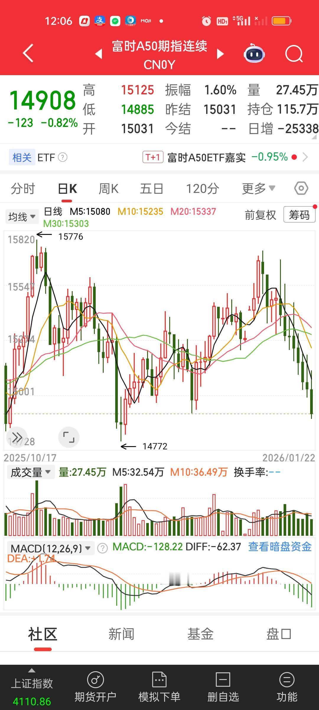中午收盘了,30个点分两次下杀在一个小时内完成。但下杀很大概率是没有结束的,1月份还有明天1个交易日以及下周5个交易日,共计6个交易日。很多人之前17连阳赚到的钱已经全部倒出去了,富时A50最近下跌幅度不小啊。但还没到位,先看14660,今天最低14885,14660/14885=0.9849,也就差1.51%。 主力资金净流入方面,还是没有净流入超过10亿的个股,净流出方面增加了宁德时代和兆易创新。加上上午的三花智控加通富微电,已经有4只个股净流出超10亿了。