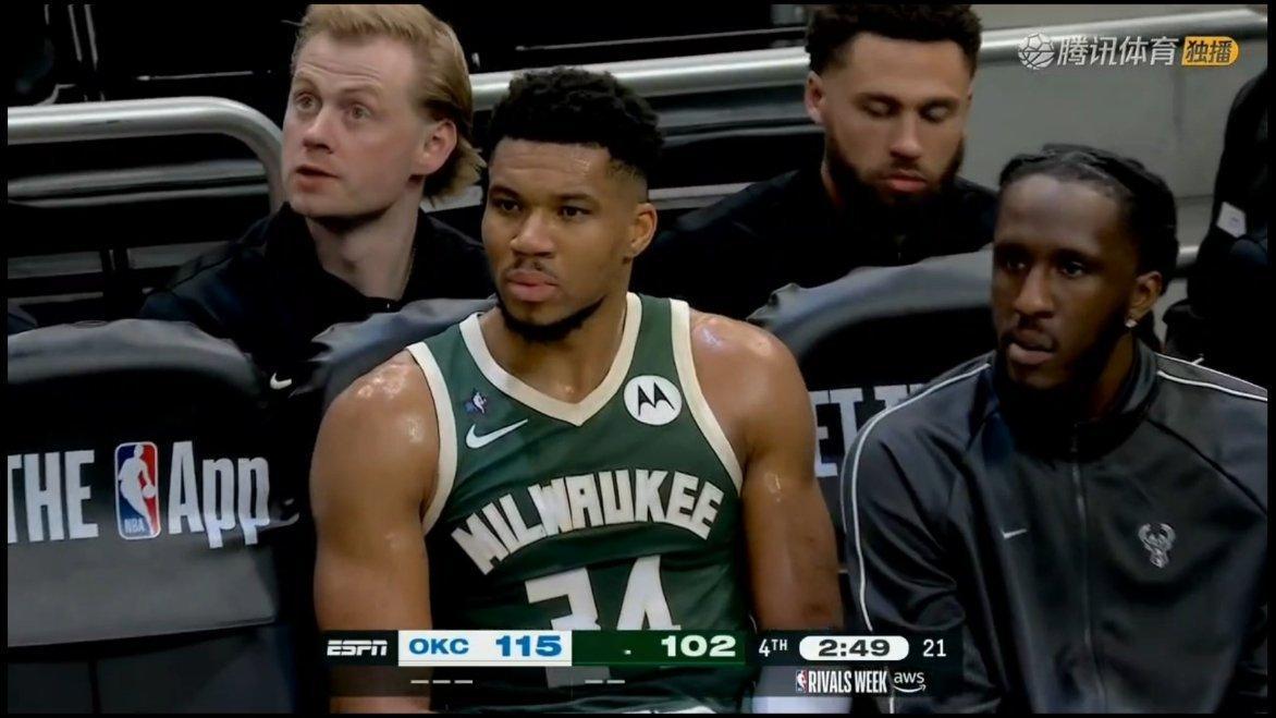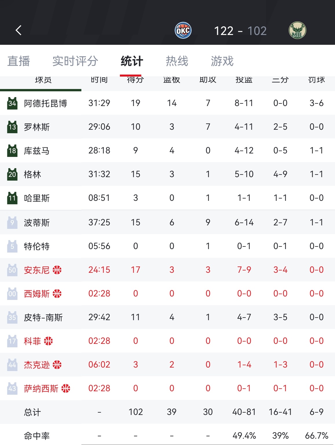 亚历山大19中16超高效率,砍下40分7板11助雄鹿102-122不敌雷霆,最近7场比赛输掉5场,继续排名东部第11雷霆vs雄鹿