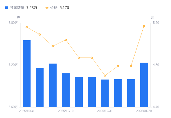 日期A股户数(户)流通A股户均持股数(股)户均持股市值(万元)2026-01-207231714512.877.502026-01-106996715000.317.192026-01-096996715000.317.192025-12-316993815006.537.052025-12-207030214928.837.272025-12-197030214928.837.272025-12-107084314814.837.472025-11-287220414535.587.242025-11-207158614661.067.462025-10-317553914108.417.28