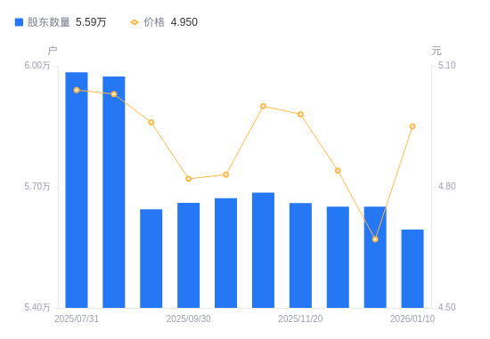 日期A股户数(户)流通A股户均持股数(股)户均持股市值(万元)2026-01-105594349176.7624.342025-12-105650848684.9322.742025-11-305650848684.9323.562025-11-205659548610.0924.212025-11-105685748386.1024.192025-10-205672148502.1123.432025-09-305660448602.3623.432025-09-205644448740.1724.182025-08-105973546054.9123.172025-07-315983845975.6323.17