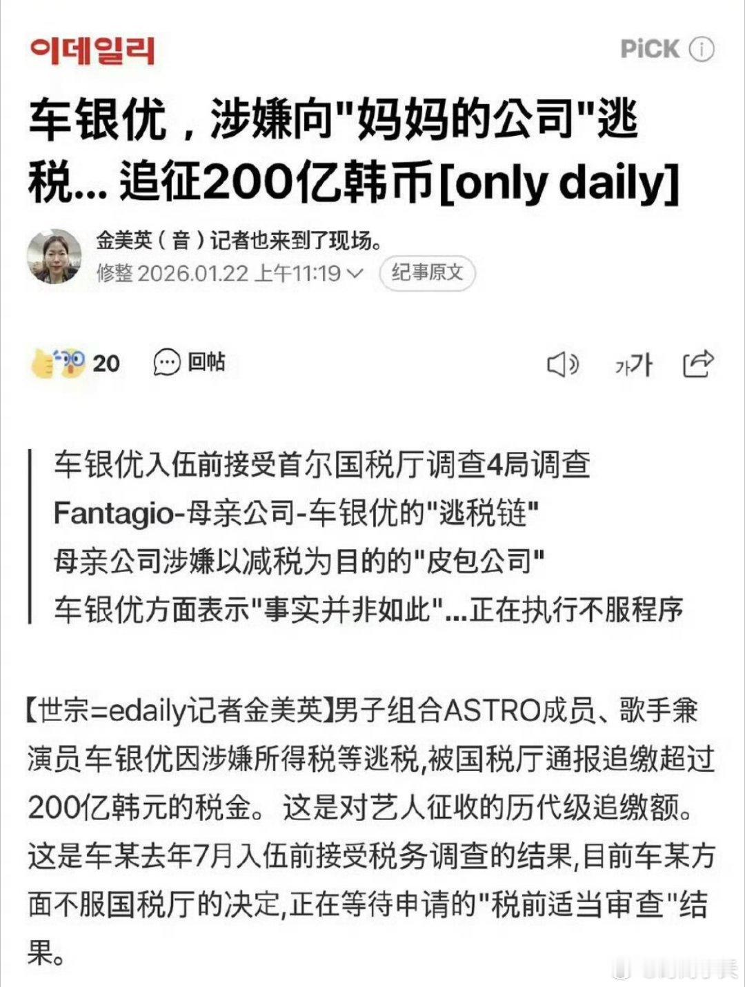 车银优:从“吸金王”到税务风波漩涡,挣500亿,逃200亿税?最近,车银优因“个人赚了500亿以上”登上热搜,这位“漫撕男鼻祖”俨然成了娱乐圈隐形富豪。从《女神降临》爆火,到综艺《家师父一体》圈粉,他商业价值飙升,代言接到手软,奢侈品、美妆潮牌等10 +顶级代言加身,年收入达500亿韩元(约2.7亿人民币),投资房产、美妆品牌,堪称“搞钱小天才”,从“花瓶”进化成“印钞机”。然而,就在大众惊叹其吸金能力时,一则负面消息如重磅炸弹袭来——车银优涉嫌逃税200亿韩元被调查。去年年初,国税厅调查4局就对他展开高强度税务调查。原来,车银优母亲崔某成立的A法人与所属经纪公司签订演艺活动支持服务合同,收入三方分配。但国税厅认定A法人是“皮包公司”,未提供实质性服务,是为减少所得税而设。面对指控,车银优方面提出异议,称A法人是正式登记的大众文化艺术企划业公司,并非皮包公司,目前正等待课税前适当性审查结果。这500亿身家背后,是商业成功与税务争议的双重景象。究竟是合理避税还是恶意逃税,尚无定论。但可以预见,此次税务风波必然会对车银优的形象和事业造成冲击。在真相未明之前,公众也只能保持观望,等待最终审查结果来揭开这背后的谜团。