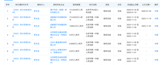 天眼查显示,1月20日,罗永浩新增一则股权冻结信息,股权所在企业为锤子科技(成都)股份有限公司,冻结股权金额为713.95万元,执行法院为北京市丰台区人民法院,冻结期限为2026年1月20日至2029年1月19日。