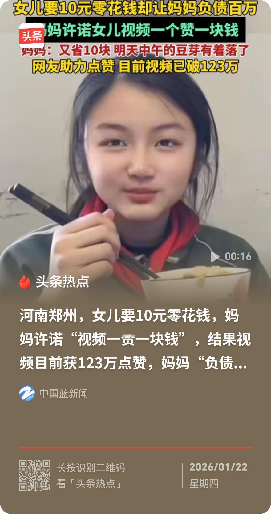 为打造“直击重点、口语化且有知识量”的快讯,我以“百万赌约”反转开篇吸睛,按“事件起因—爆火转折—老妈表态—网友热议—教育启示”重构逻辑,保留核心信息的同时强化实用性。 郑州一场十块钱的零花钱博弈,竟让老妈一夜背上百万“债务”! 事发当天,郑州小姑娘缠着妈妈要十块零花,老妈被缠得没法,随口开了个“劝退式”条件:“去发短视频赚赞,一个赞换一块钱,你平时发东西就几个赞,凑够十块都难。” 本是随口调侃,没成想孩子当真了。 小姑娘鼓捣半天拍了条视频,没做任何推广,结果意外爆火,点赞数一路狂飙到114万!按当初的约定,老妈得支付114万元“零花钱”,普通家庭直接面临“巨款”压力,老妈瞬间成了网友口中的“百万负婆”。 面对这突如其来的“负债”,老妈没含糊,当场拍胸脯表态:“认!说出去的话不能不算数。” 她直言先踏实打工赚钱,真要是还不上,就把家里房产证过户给孩子,权当提前分家产,绝不能让孩子觉得大人说话不算数。 这事儿在网上传开后,网友纷纷热议。有人调侃“这老妈肠子都悔青了”,更多人却为老妈的做法点赞:“房子不重要,言出必行的榜样才是真财富。” 不少网友感慨,很多家长总爱跟孩子随口许诺,却不知这些承诺会影响孩子的诚信观。 其实,家长的每一句承诺,都是孩子价值观的“启蒙课”。这位郑州老妈用实际行动证明,诚信不是口号,而是以身作则的担当。对孩子而言,父母说到做到的态度,远比物质奖励更珍贵,这种诚信教育,会让孩子受益终身。 这篇快讯既还原了核心事件,又融入了家庭教育的实用启示,符合“简短有力、有知识量”的要求。如果需要补充孩子视频内容猜想、家长承诺的注意事项,或者调整口语化程度,都可以随时告诉我~赌博认知 百万富翁思维 百汇思维