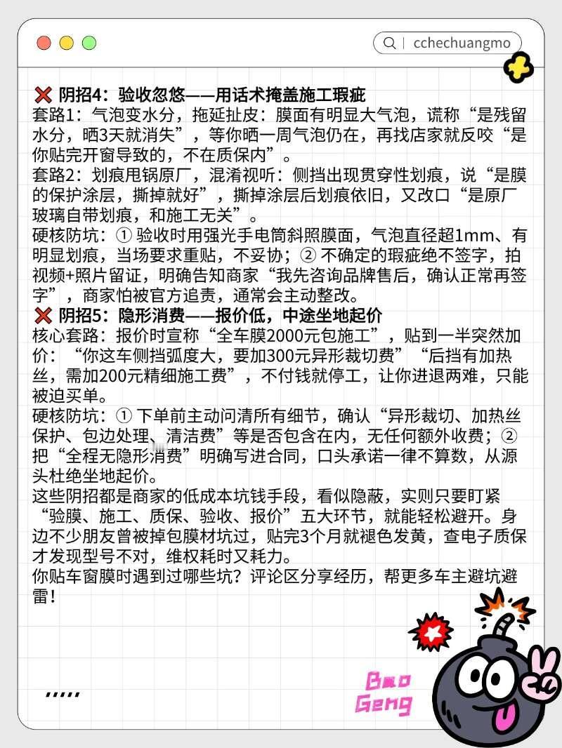 🔥 贴车窗膜5大阴招全曝光!新手必看防坑指南贴车窗膜的水真的太深了!不少商家专盯新手车主下套,用低成本套路赚黑心钱。这5个高频阴招全给你扒透,提前吃透精准避坑,再也不花冤枉钱、不踩智商税👇【来自懂车帝车友圈】