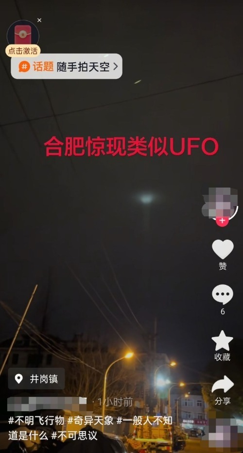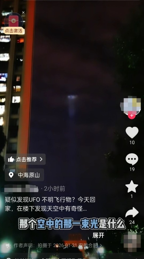 1月21日晚,多位市民在社交平台发布的视频、图片显示,天空中出现了光圈、光点、光柱。有市民表示,开始以为是月亮,但观察了一段时间发现不是月亮,因为它突然灭了,然后又突然亮了。还有市民对此很好奇,“合肥天空出现的这个是什么?有光点,还有光柱下来!一会就不见了,一会又出来了,动的幅度还比较大。”