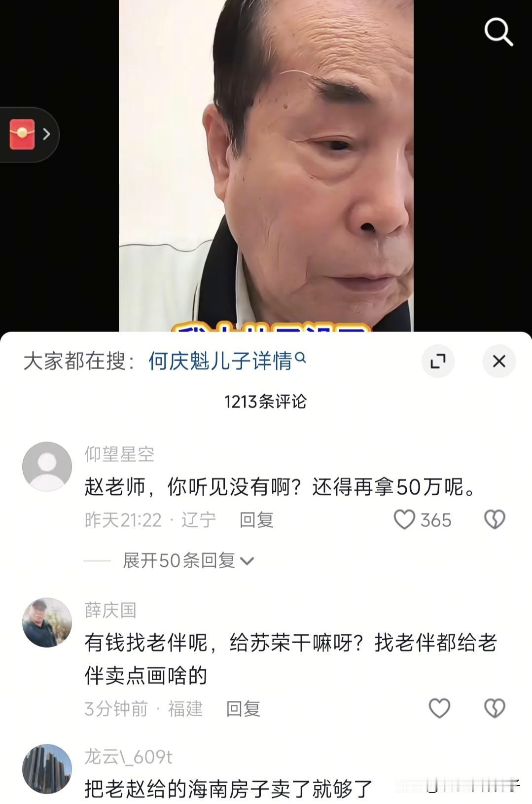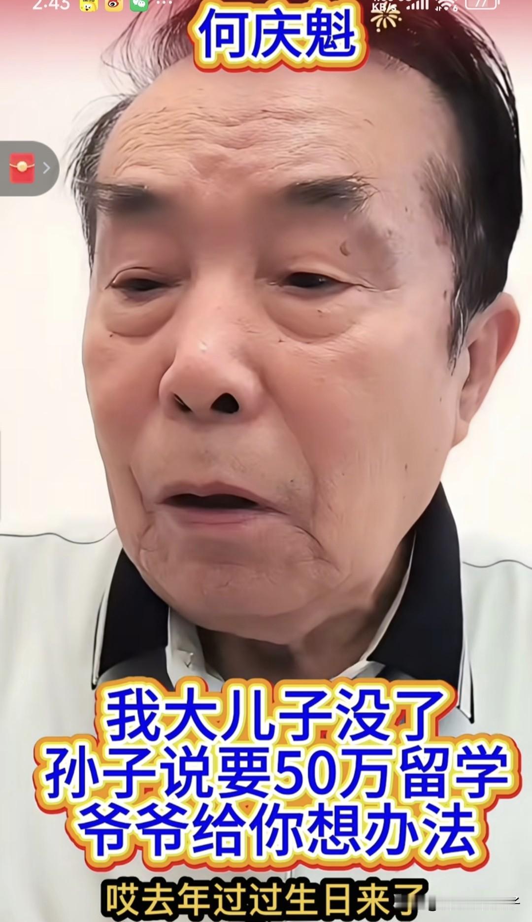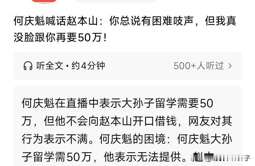 “何庆魁喊话赵本山:你总说有困难吱声,但我真没脸跟你再要50万”,刚刚,看到一位作者文章的标题。 心里想,不管怎样,何庆魁也不至于舍出老脸向老赵要钱吧! 出于好奇,特意去翻了一下视频,何庆魁确实提到孙子留学需要50万,只不过,并没有直接喊话赵本山,至于完整直播啥情况?没看到,不得而知。 视频中,何庆魁表示:“我大儿子没了,孙子现在念大学,去年过生日,来了说打算留学,至少需要50万。 我已经80岁了,如果能挣来这些钱,就给孙子拿,要不只等尽最大努力,凑多少就是多少”。 或许何庆魁只是想唠唠家常,然而,网友在评论区提到赵本山,可能理解为在跟老赵念叨。 大家都知道,何庆魁跟赵本山多次合作,包括小品,以及电视剧,写了很多剧本,后来似乎慢慢的疏远了,到底什么原因?不得而知。 另外,何庆魁好歹也算名人,还不至于连孙子的留学费用都没有吧,有点难以置信。