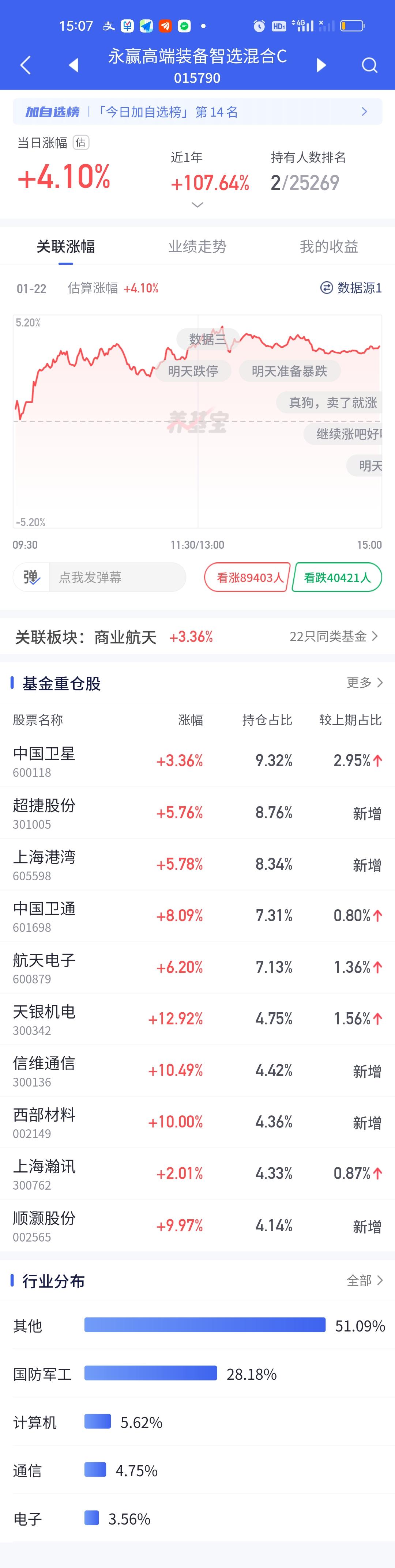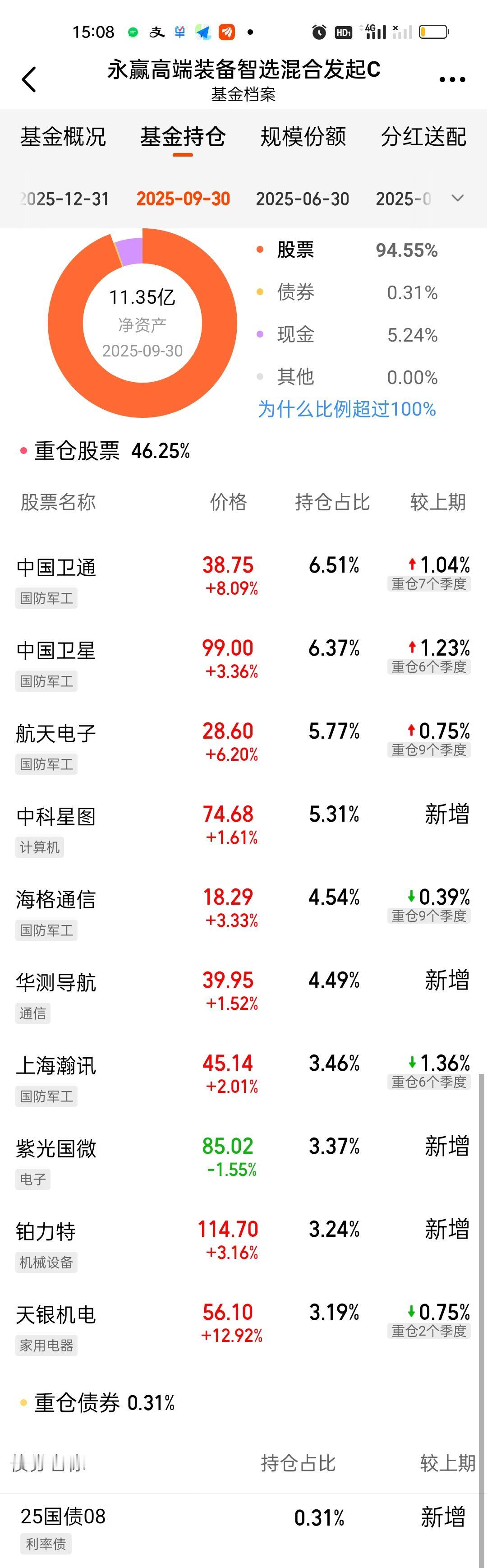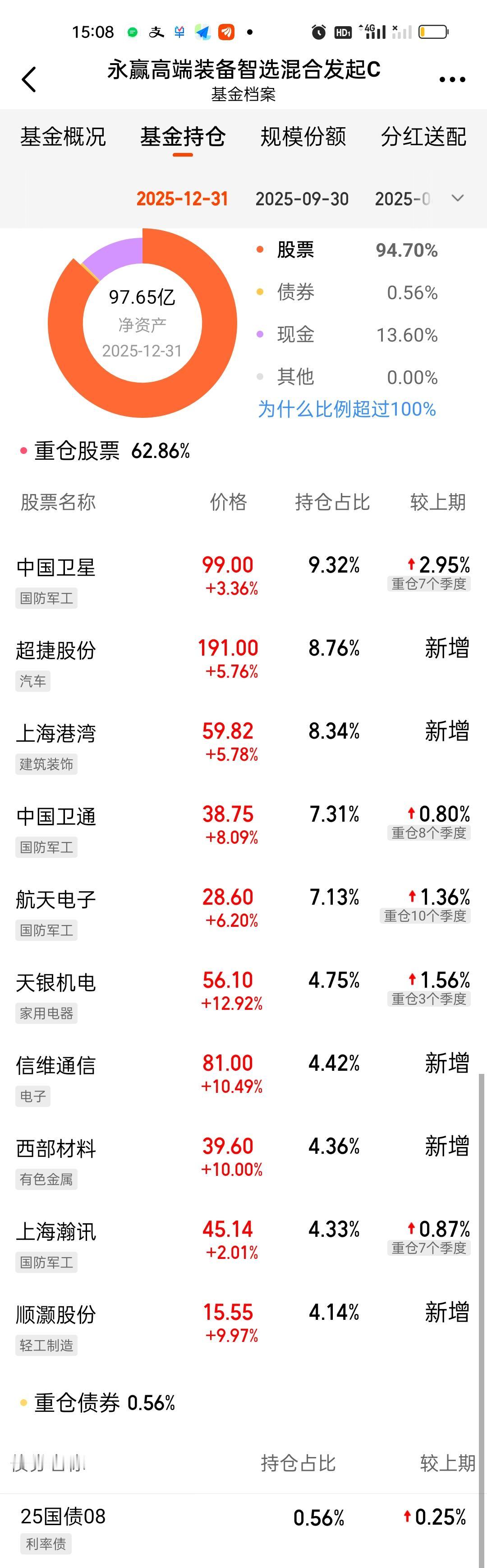 从今天的表现来看,永赢高端装备第四季度调仓是非常成功的,不仅前十大重仓股占比从46.25%提升到了62.86%,基金规模也从11.35亿增加到了97.65亿。我们可以很明显的看出永赢和德邦的经理之间的差距。德邦稳盈半个月前的那个限购还历历在目。基金规模大幅增加不是这只基金不能持续盈利的借口。曾几何时永赢管理的基金规模加起来也只有几十亿,现在已经接近6400亿了。 高端装备这次调整,新增了5只个股,超捷股份,上海港湾,信维通信,西部材料和顺灏股份。今天分别上涨了5.76%,5.78%,10.49%,10.00%,9.97%,抓到2只涨停。舍弃的5只中科星图,海格通信,华测导航,紫光国徽,铂力特今天的表现分别是涨1.61%,3.33%,1.52%,跌1.55%, 3.16%。另外中国卫星的持股比例增加了3%。高端装备这次的调整是很成功的。