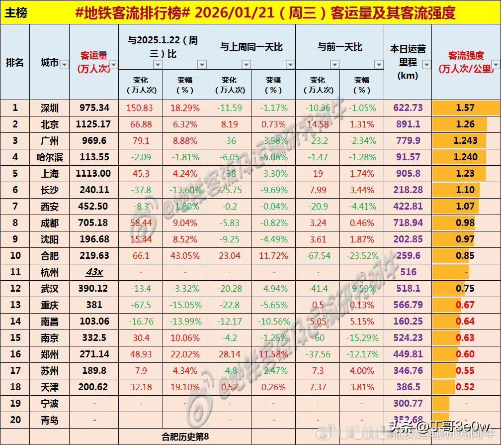 北京地铁昨日客流量达1125万人次以上,连续两天排名全国第一[呲牙][呲牙][呲牙] 爆料 身边事 中国地铁客流日报 地铁客流排行榜 昨日客流 排行榜 周三 北京 2026年1月21日 星期③ 全国重点城市轨道交通客流量排行榜: 北京:1125.17万 上海:1113.00万 深圳:975.34万 广州:969.60万广州地铁 成都:705.18万 西安:452.50万西安身边事 杭州:432.00万杭州身边事 武汉:390.12万武汉地铁 重庆:381.00万重庆身边事 南京:332.50万南京地铁 郑州:271.14万 长沙:240.11万长沙地铁 合肥:219.63万合肥地铁 天津:200.62万天津身边事 沈阳:196.68万 苏州:189.80万苏州爆料 青岛:113万+ 宁波:113万+宁波地铁 哈尔滨113.55万哈尔滨爆料 南昌:103.06万