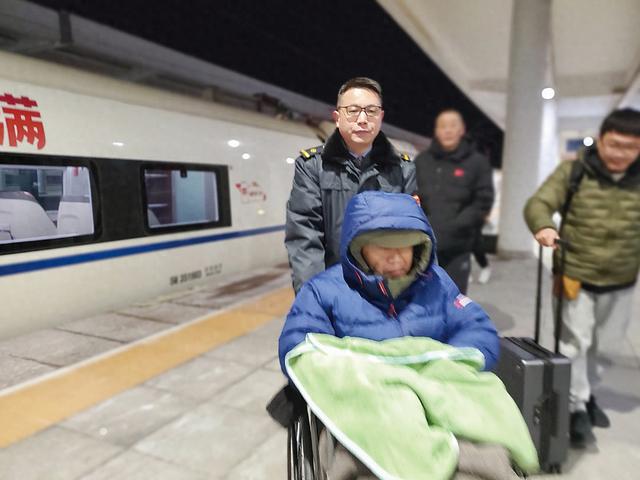 昨日凌晨2时26分,列车尚未进站,赵亮、董渊已带领工作人员与家属在指定站台等候。列车停稳后,他们迅速上车。工作人员分工协作,有人稳定轮椅,有人轻托患者身体,全程动作谨慎轻柔。车站也已提前安排好转运通道,从站台至出站口一路畅通。董渊小心推着轮椅,其他工作人员主动协助搬运随身行李,并提前协调好接驳车辆的停放位置。“天气冷,盖好毯子,注意保暖。”董渊细心叮嘱。仅用5分钟,旅客便被安全护送上车,前往医院。