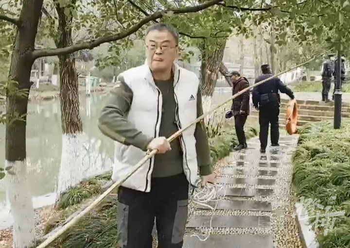 赶到河边时,张女士离岸约两三米,浑身颤抖,还不时和岸上惊慌的孩子交流,俞师傅迅速将竹竿递过去,大喊:“抓住杆子!我拉你上来!”