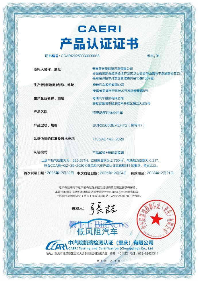 赵长江表示,“智界R7风阻系数0.217,是在国家标准工况条件下,基于中汽研检测风洞国标标准测试,在车速120km/h下的测试成绩,也是目前可查询经公证公示符合国标要求的商用量产SUV最低风阻纪录。”