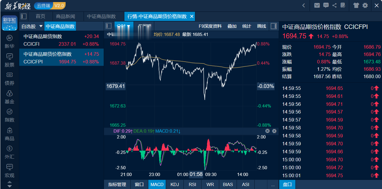 截至下午收盘时,中证商品期货价格指数收报1694.75点,较上一交易日上涨14.75点,涨幅0.88%;中证商品期货指数收报2337.01点,较上一交易日上涨20.34点,涨幅0.88%。