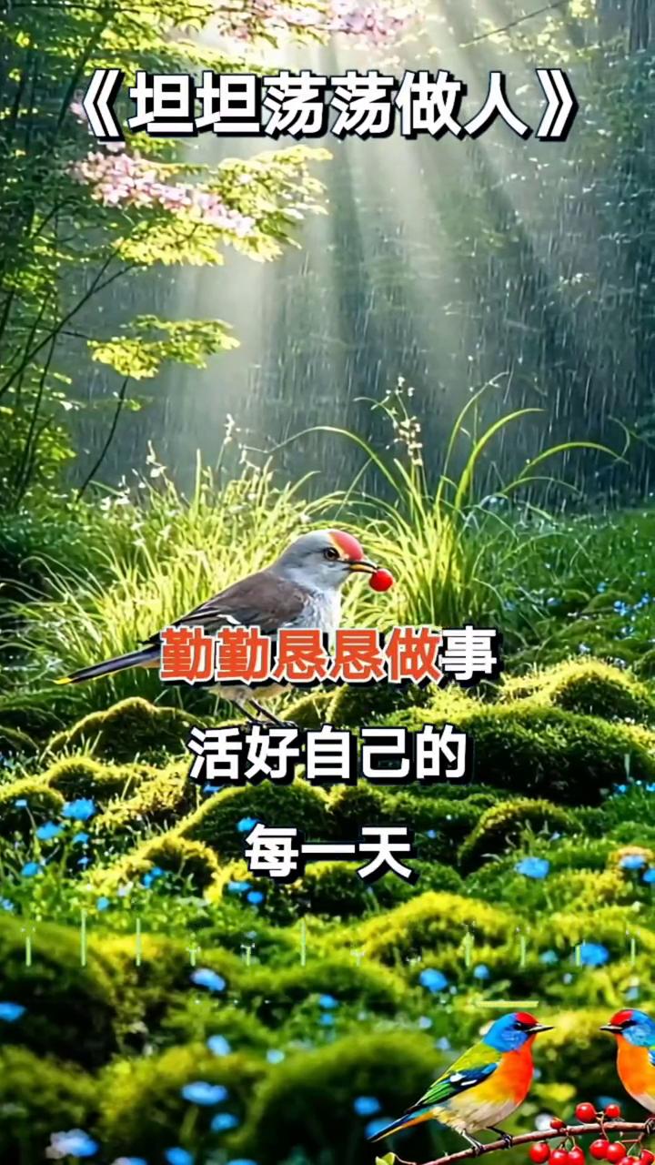 《坦坦荡荡做人》。 坦坦荡荡做人,本本分分做事。走在人生这条路上,早有认知,有啥也不能丢掉。做人的品质,无论任何时候,腰板儿都要挺直,守好自己的初心,方能有终有始。虽然正道是沧桑,那也要坚持,输啥也不能输掉应有的风姿。哪怕一路走来,风霜雨雪不止,做人原则永远放在最重要位置。 坦坦荡荡做人,本本分分做事,走好自己的每一步,不计得失。时光匆匆,犹如流水,转瞬即逝。只有别偏离人生方向,才能幸福一辈子。坦坦荡荡做人,勤勤恳恳做事,活好自己的每一天,踏踏实实活好自己的每一天。人这一生真的不能太过自私,生活不仅有眼前苟且,还有远方和诗。