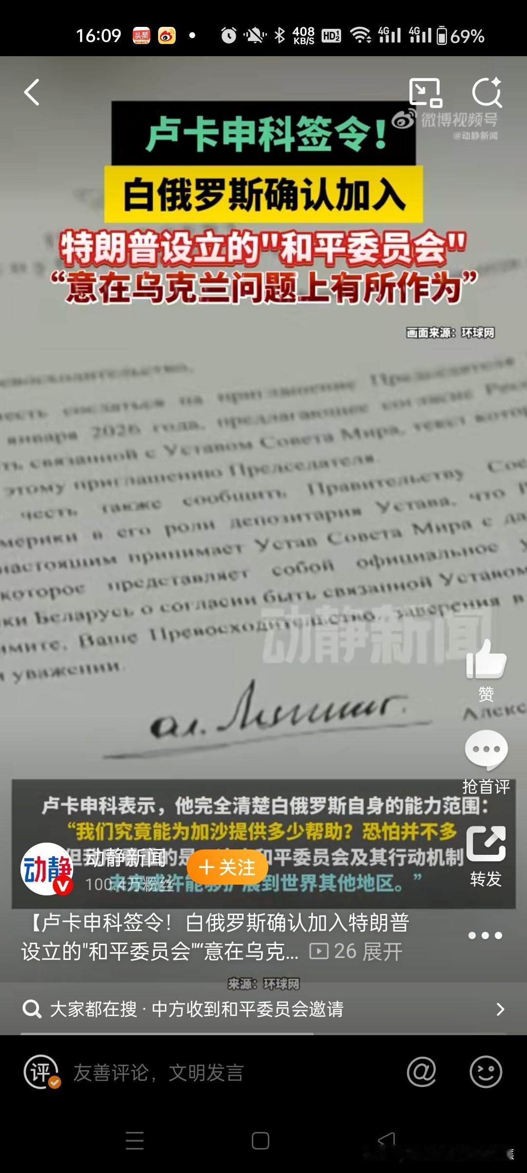 卢卡申科为何绕过中俄宣布白俄罗斯加入由特朗普推动设立的“和平委员会”?俄罗斯对此态度中性,而中国更倾向于联合国主导的世界体系。 卢卡申科宣布白俄罗斯加入由特朗普推动设立的“和平委员会”,其核心意图是借助这一平台介入乌克兰问题,提升白俄罗斯在地区事务中的影响力。@动静新闻 一、事件背景与直接动因 加入“和平委员会”的具体行动: 2026年1月20日,白俄罗斯总统卢卡申科签署文件,正式确认白俄罗斯加入美国前总统特朗普倡议设立的“和平委员会”,并承诺落实其宪章条款。1 公开表态的核心动机: 卢卡申科在签署文件时明确表示,此举旨在“在乌克兰问题上有所作为”。这反映出白俄罗斯试图通过参与西方主导的多边机制,在俄乌冲突中为自身争取更主动的外交角色。1 二、深层战略意图分析 平衡地缘政治压力: 白俄罗斯长期被视作俄罗斯的紧密盟友,但其加入由美国前领导人牵头的组织,暗示卢卡申科政府有在大国博弈中拓宽外交空间的意图。尤其是在西方持续制裁的背景下,此举或许是为缓和与欧美关系、减轻经济压力而进行的策略性尝试。 提升区域话语权: 通过介入乌克兰调停进程,白俄罗斯能够强化其作为东欧地区“协调者”的形象,避免被边缘化,还能借此增强对周边事务的干预能力,这符合其国家安全诉求。 三、关键风险与挑战 对俄白关系的潜在冲击: 尽管白俄罗斯强调在乌克兰问题上“独立作为”,但加入特朗普推动的机制可能引发俄罗斯的疑虑,考验两国联盟关系的稳定性。 实际影响力的局限性: “和平委员会”由特朗普设立,其效力受限于美国国内政治环境(如特朗普是否重新执政)以及国际社会的认可度。白俄罗斯能否通过该平台实现实质性突破,仍存在较大不确定性。 注:公开信息显示,卢卡申科的决策主要基于白俄罗斯单方面表态,俄方尚未就此公开回应,后续发展需观察多方互动。1