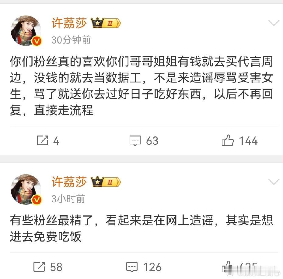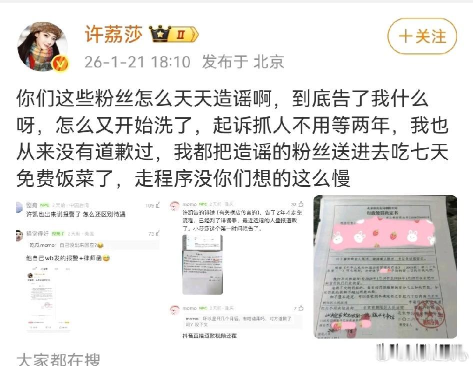 1 月 21 日,许荔莎发文,言语间满是挑衅意味。她称已将那些为许凯 “冲锋陷阵”、造谣她的粉丝送进了局子,让他们吃上 7 天 “免费饭菜”。同时,她还强调自己从未被许凯起诉过,并且表示起诉流程并不像大家想象的那么慢。为了让网友们信服,许荔莎晒出了行政处罚书。从这份处罚书可知,许凯的粉丝因造谣抹黑许荔莎,被依法处以行政拘留 7 天的处罚。而且,这些粉丝也认下了这个结果,并未提出上诉。许荔莎还不忘嘲讽许凯的粉丝:“你们这种粉丝最精了,表面上在网上造谣,实则是想去里面吃免费的。” 这波嘲讽可谓十分犀利,直接让许凯的粉丝破防了。从许荔莎能在短时间内将造谣者送进局子这件事可以看出,明星若真要起诉一个人,速度其实是很快的,根本无需几个月、大半年,甚至好几年。由此可见,很多时候明星发出的律师函,更多是起到警告和安抚粉丝的作用。当下,粉丝追星是很常见的现象。粉丝们出于对偶像的喜爱,常常会在网络上维护他们。然而,这种维护有时会走向极端,就像这次许凯的粉丝,为了所谓的 “支持偶像”,不惜造谣抹黑他人。他们以为自己是在为偶像冲锋陷阵,可实际上却给偶像带来了负面影响。对于偶像而言,如果真的被冤枉,他们有能力也有途径去合理维权。明星拥有专业的团队和资源,在面对不实言论时,完全可以通过法律手段来解决问题,根本不需要粉丝以这种不恰当的方式去 “帮忙”。粉丝们应该明白,追星是一种个人喜好,但不能盲目地为了偶像失去理智。追星可以是汲取偶像的正能量,学习他们的优点,让自己变得更好。而不是在网络上肆意攻击他人,甚至触犯法律。许荔莎这次的做法,给粉丝们敲响了警钟。在追星的道路上,粉丝们要保持理性,用正确的方式表达对偶像的喜爱。偶像也应该引导粉丝树立正确的价值观,共同营造一个健康、和谐的追星环境。毕竟,只有粉丝和偶像都以积极正面的形象出现在大众面前,才能让追星这件事变得更有意义。