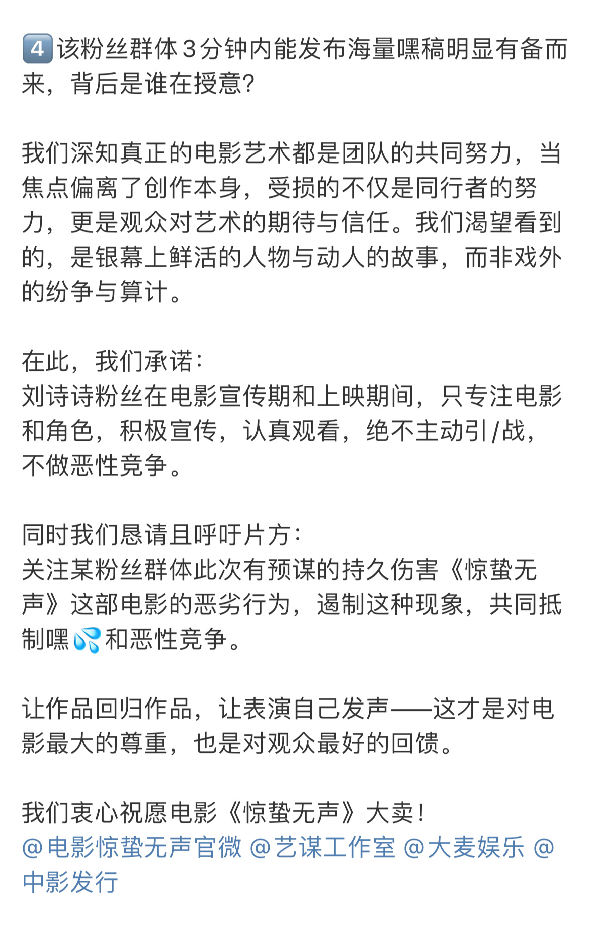 刘诗诗粉丝发了倡议书提倡爱护作品今天电影惊蛰无声预告上线被同期花粉丝开了百余条嘿