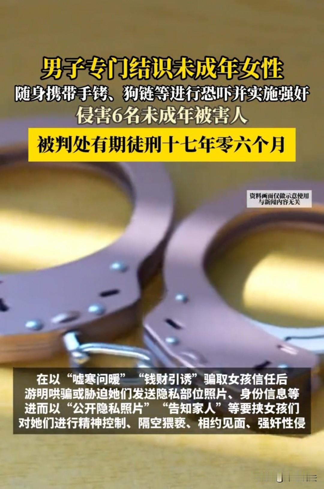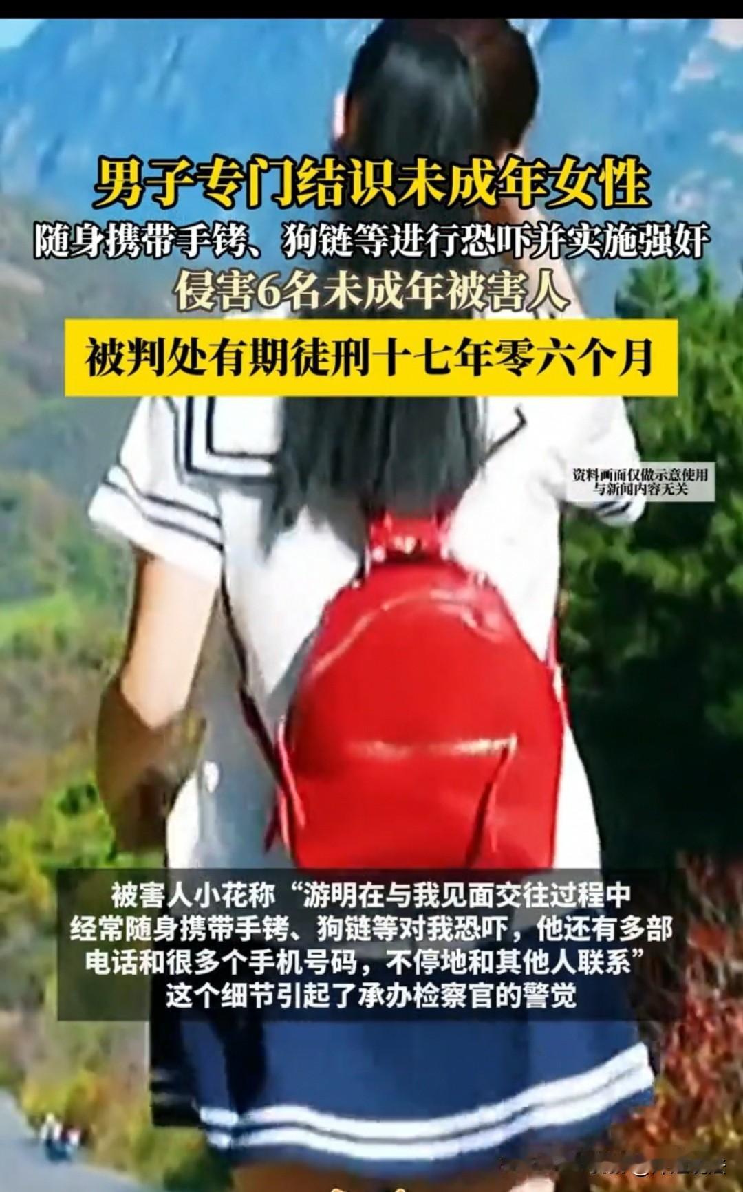 河南南阳,一男子在网上和多名未成年女孩聊天,起初会发些红包给对方,以此获取对方的信任,随后就套取别人的私密照片、家庭地址等,最后用这些信息威胁未成年人和他视频,隔空猥亵这些小女孩,又用这些内容威胁她们线下见面,诱骗实施了侵犯行为。 后来,被一名家长发现后,立即报了警。该男子居然称只是聊天,没有欺负她们,面对男子拒不认罪,民警将他五年内的所有聊天内容、酒店信息全部进行数据恢复,才发现他在这两年时间里,不仅随身携带手铐、狗链作为恐吓工具,还在面包车、出租屋、宾馆等隐蔽地点,先后对五人实施了侵犯,其中还包括一名幼女,对另外一名未成年人实施了猥亵,最终被判处有期徒刑十七年六个月。他居然还不服,提起上诉,理由是这些聊天记录根本不能作为证据。 小美(化名)是家中的掌中宝,特别受到父母的宠爱,因此,她要什么都会给她什么。 小美说,同学都有手机,自己也想要一个。 家长有点犹豫了,这么小的孩子,拿手机干嘛呢?他们担心自己管控不住,万一出点闪失怎么办? 小美却说,我虽未成年,但也不是小孩子了,这些基本需求还是要满足的,不然我们对外面的世界越发好奇,就会寻找其他了解外面世界的途径,不是更危险吗? 她说自己要好好学习,有很多题不懂,得用软件辅助自己学明白。 现在是网络时代,我们就要跟着这个时代的方式来学习,不能闭门造车,得多多寻求解题的方法,不是吗?这样才能提高学习效率。 父母一想,女儿说的倒是真的,自己在工作当中不懂的,都是直接上网问,再遇到同类的事情就懂了。 因此有个手机还确实挺方便。 于是他们就给小美买了一款手机,让她好好学习,不要玩游戏。 女儿倒是听话,从来不会装那些游戏软件,但是却迷上了聊天,因为上面总有一个大哥哥会关心自己,还会发红包给自己。 这种关系有别于父母的关系,是不给自己任何压力的好。 这个网上的男子叫游明,一开始总会叮嘱小女孩要好好学习、听父母的话,还花钱让她买些好吃的东西,别累着、别饿着。 小美根本没有对游明设防,反而更加信任对方,连自己家里做什么、父母干什么、有几口人,通通告诉了游明。 而游明也对小美越发“好”,给的钱更多了,甚至让她去买衣服、买鞋子,想怎么花就怎么花,不用为他省钱。 小美觉得自己太幸福了,有这样一个大哥哥。 随着游明了解小美的动态越多、信息越多,他便开始一反常态地威胁小美。 他先是让小美拍张私密照过去。 小美害怕了,幡然醒悟,坚决不从。 可是游明掌握了小美的家庭信息、家庭成员信息,威胁她不从就对她的家人不利。 小美年纪小,经不住恐吓,又想着对方只要一张,之后就不会再纠缠,便想妥协一次,拍了一张过去。 谁知道游明更加过分,这下更能拿捏小美了,又用这张照片威胁小美和自己视频,小美在恐惧中无法推脱,只能照做。 最后游明隔空猥亵了小美。 小美不敢告诉父母,想自己处理好这件事,找游明好好谈谈,不愿再继续这样的生活。 游明发来信息说,想见她一面,从此以后各走各的路,互不打扰。 小美本不想去,但如果不去,又要受到游明的骚扰,想来个一刀两断,就壮着胆子去了。 可游明早已设计好圈套,见面地点选在一辆面包车里,小美一出现,他就亮出工具进行恐吓,二话不说就对其实施了侵犯。 小美回家后,躲进房间放声大哭。 提前下班的父母察觉女儿受了欺负,立刻冲进去抱起女儿,焦急地问她到底发生了什么。 最开始小美还不想说,但父母急切的眼神容不得她迟疑,最后一五一十把事情讲了出来。 父母一听如遭天崩地裂,赶紧报警。 民警随后将游明抓捕归案,他居然称小女孩胡说,他们只是在网上聊天,其他啥也没干。 民警经过研判,觉得游明作案手段老练且极具危险性,怀疑他常对类似小美的未成年人下手。 因此,他们决定对游明五年内的所有聊天记录、酒店入住信息及出行轨迹全部进行数据恢复,追查其犯罪事实。 结果发现受害者不止小美,还有另外五名未成年人,其中一名是未满14周岁的幼女。 依据《刑法》第二百三十六条,强奸妇女、奸淫幼女多人、情节恶劣的,处十年以上有期徒刑、无期徒刑或者死刑。 本案中,游明强奸5名未成年女性(含一名幼女),且使用手铐、狗链恐吓胁迫,符合“强奸多人+奸淫幼女+情节恶劣”多重从重情节,依法顶格从重量刑。 另外,他还猥亵了一名未成年人。 一审判决:游明有期徒刑17年6个月。 他居然仍不服,依旧称:只是聊天,未对她们实施侵犯。 二审直接维持原判,大家都拍手叫好! 对于此事,大家如何看?素材来源于《法治日报·法治周末》。