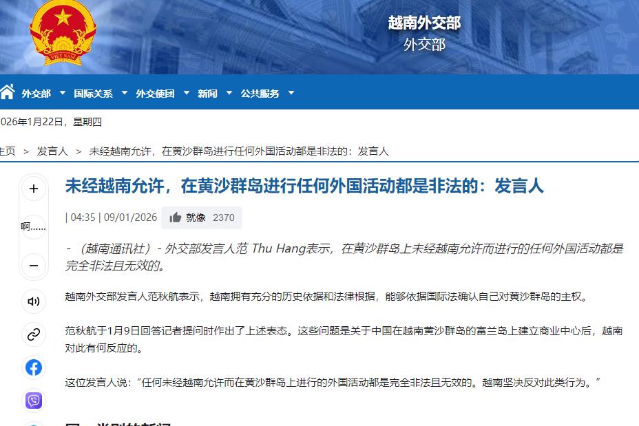 太不要脸了!1月9日,越南外交部发言人范秋姮就所谓 “黄沙群岛”发表言论,称未经越南许可在该群岛的外国活动 “完全非法、完全无效”。 对着咱们永兴岛开设商业中心的事指手画脚,还把中国西沙群岛叫“黄沙群岛”,妄称主权在越南,这波操作何止是无耻,简直是拿历史当儿戏,自己打自己嘴巴。 事情的由头很清楚,咱们在自家西沙永兴岛建商业中心,本是服务驻岛人员、完善基础设施的正常操作。 范秋姮却跳出来反对,说什么未经越南许可就非法无效,请问越南哪来的资格指手画脚?西沙群岛从古到今都是中国的,轮不到外人说三道四。 最讽刺的是,越南自己的官方文件都打了范秋姮的脸。1958年咱们发表领海声明,明确西沙属于中国,十天后,时任越南总理范文同就致函周恩来总理,白纸黑字承认并支持咱们的声明,这可是具有法律效力的官方承诺。 不光是政府层面,越南教科书也曾老实过。直到1974年前后,他们全国通用的中学教材里,还明确把西沙群岛标注为中国领土,这些教材是国家出版、全国使用的,总不能说不是越南的真实态度吧?现在翻脸就不认账,未免太离谱。 咱们对西沙的主权,可不是靠嘴说的,是有实打实的历史依据,早在两千多年前,中国先民就发现并命名了西沙,元代天文学家郭守敬还在这儿设过测量点,这是国家层面的主权行使,比越南的无端主张早了几百年。 明清时期,咱们对西沙的管辖就没断过,广东水师常年在这片海域巡逻执法,地方政府也把西沙纳入行政版图,留下的文献、航海图、碑文证据一抓一大把,这些历史印记,不是越南一句妄言就能抹掉的。 国际社会也早有共识,1930年代远东气象会议,特意要求中国在西沙设气象台;1955年国际民航组织,也承认中国在西沙海域的观测权,多个国家出版的地图和百科,都明确标注西沙归属中国,越南根本孤立无援。 越南为啥突然跳出来挑事?说白了就是见利忘义,永兴岛的发展越来越好,他们眼馋这片海域的资源和战略地位,就想靠歪曲历史抢好处,之前U23亚洲杯咱们赢了越南,他们或许也想靠这种方式转移国内情绪吧。 大家想想,一个连自己官方承诺、教科书内容都能否定的国家,还有什么信用可言?一边想和咱们深化经贸合作,赚中国市场的钱;一边又在主权问题上挑衅,典型的吃饭砸锅,这种两面三刀的做法,只会让人更加警惕。 咱们在西沙的活动,从来都是合法合规的,不管是建商业中心,还是完善防御设施,都是在自家领土上行使主权,轮不到任何国家说三道四,范秋姮的言论,不过是自导自演的闹剧,根本改变不了事实。 越南真要为地区和平着想,就该正视历史、遵守承诺,一味靠挑衅刷存在感,只会让国际社会看清其虚伪面目,中国向来愿意和平协商解决分歧,但主权问题没有任何妥协空间,这一点越南必须拎清楚。 其实越南心里也明白,自己的主张站不住脚,他们这么做,更多是演给国内看,想凝聚民意,可靠歪曲历史、挑衅邻国换来的支持,终究是空中楼阁,迟早会因为谎言破灭而崩塌。 领土主权是国家的核心利益,容不得半分觊觎,越南的无耻挑衅,只会让咱们更加坚定守护领土完整的决心,历史不会说谎,国际共识不会动摇,任何试图觊觎中国领土的行为,都只会以失败告终。 国家信用是立足国际社会的根本,越南一再推翻自己的承诺,只会自毁口碑,与其在主权问题上做无用功,不如静下心来和邻国合作共赢,靠谎言和挑衅走不远,尊重历史、尊重主权才是唯一正道。 大家对此有什么看法呢?欢迎各位在评论区留言!