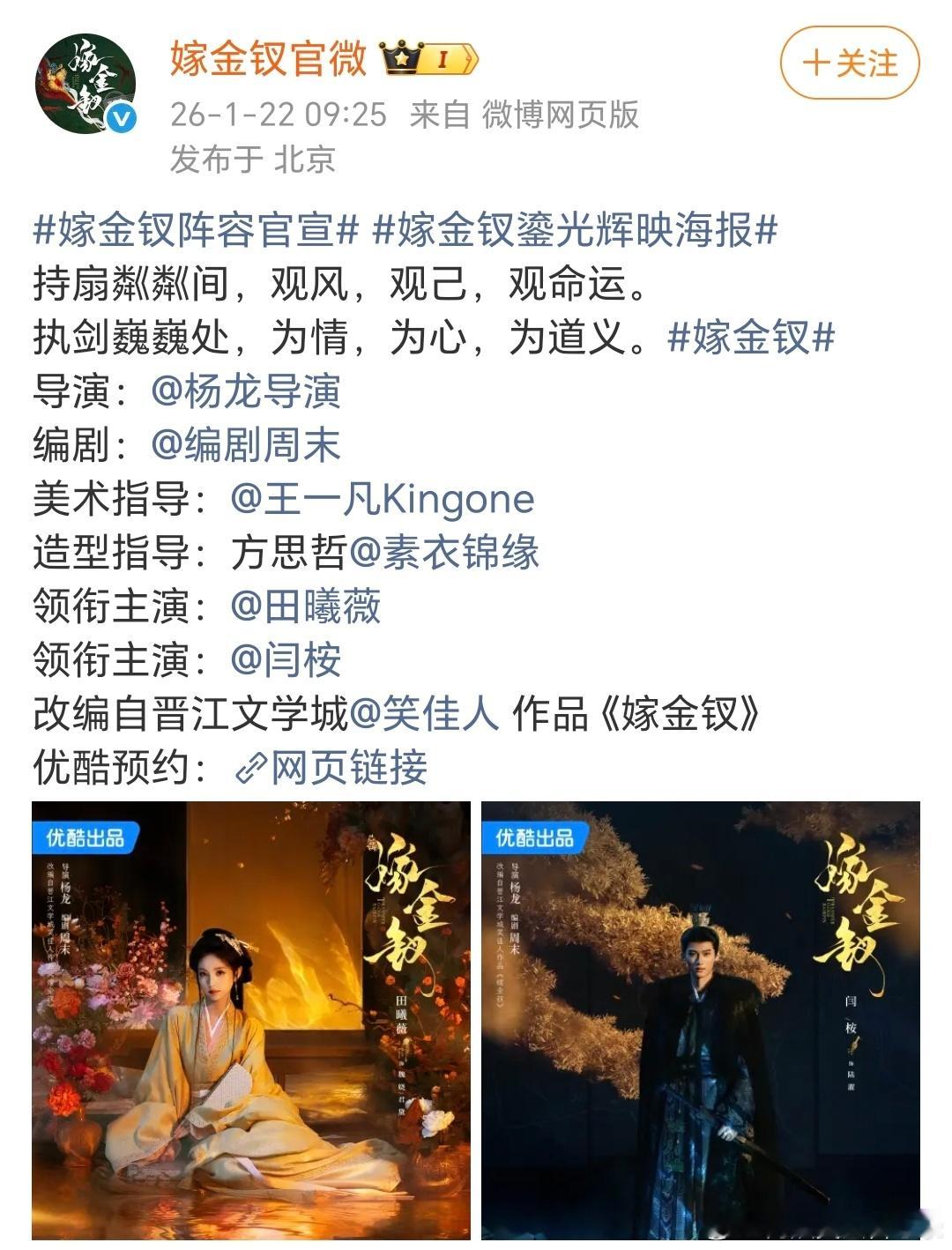 嫁金钗阵容官宣田曦薇 闫桉《嫁金钗》正式官宣好好好,俊男美女