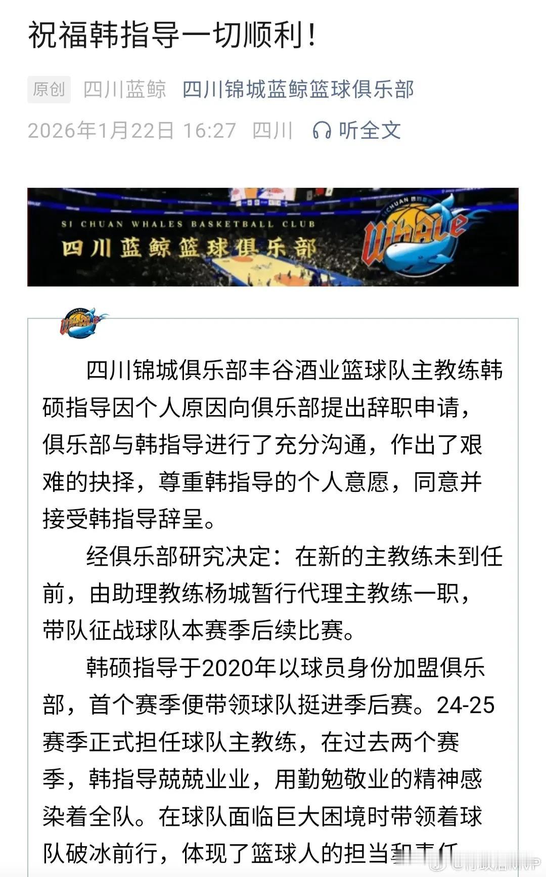 四川男篮主教练韩硕辞职,主要有有这几个原因。 1、球队17连败一场没赢,执教压力太大,输的自信心输都没有了!再输下去对自己的教练生涯和名声都不利,趁早离开趁早解脱。 2、球队没钱买好的外援,能打的萨姆纳被广东队挖走,国内球员因为工资问题也很难拼尽全力打比赛。外援不给力,国内球员能力不足,巧妇难为无米之炊。 3、俱乐部陷入财务困难,短时间内很难有改善。目前球队17连败已经进不去季后赛附加赛,没有什么赛季目标了,唯一的目标赢一场都非常困难,如果一个赛季都赢不了一场比赛注定是耻辱记录,谁都不想背黑锅。 总结,CBA应该有升降规则,优胜劣汰是职业体育的生存法则,目前后五个球队都是无欲无求的,不想怎么去改变球队就知道赛季末等联赛分红利,这就和以前的大锅饭一样,无法提升CBA联赛的整体水平。