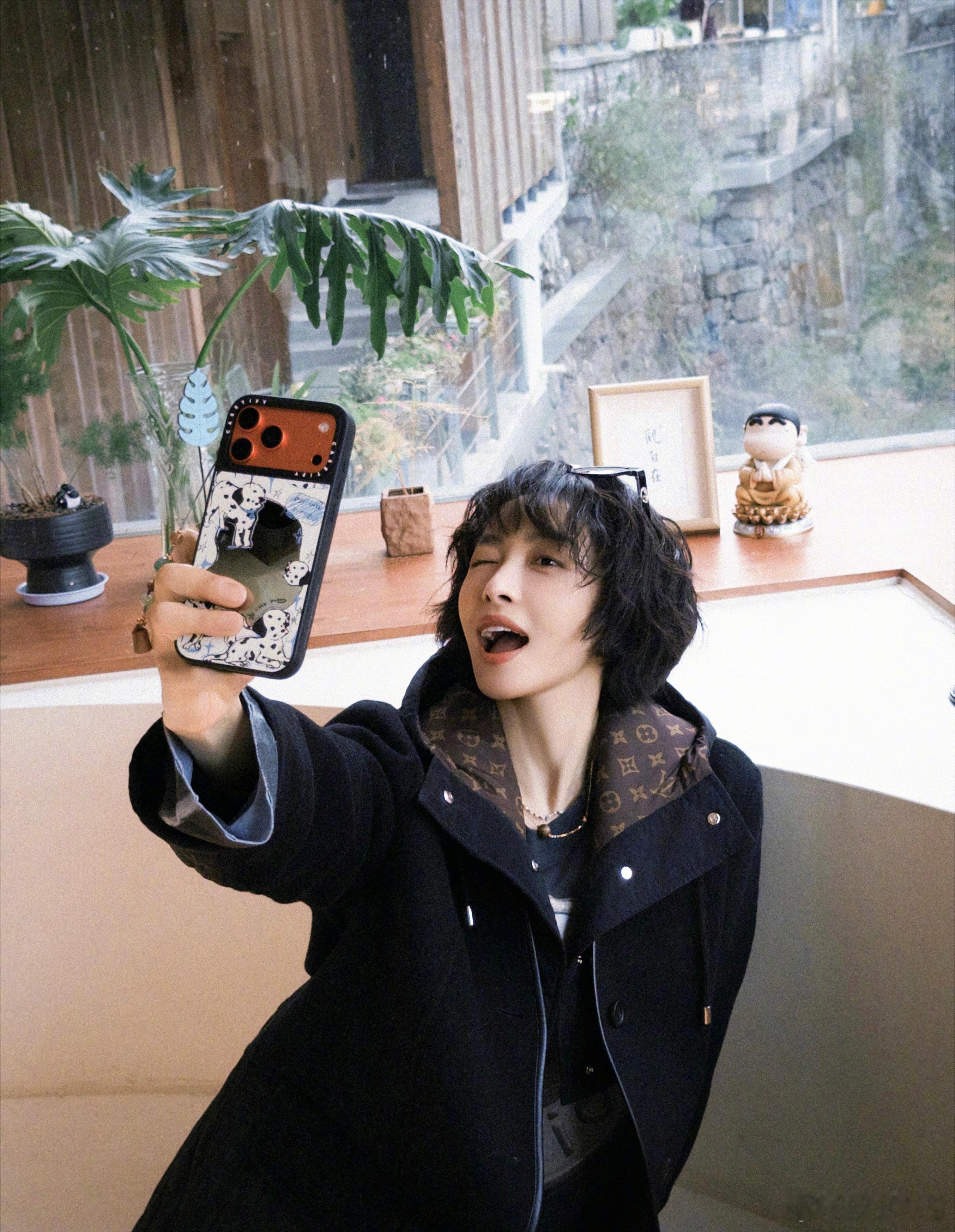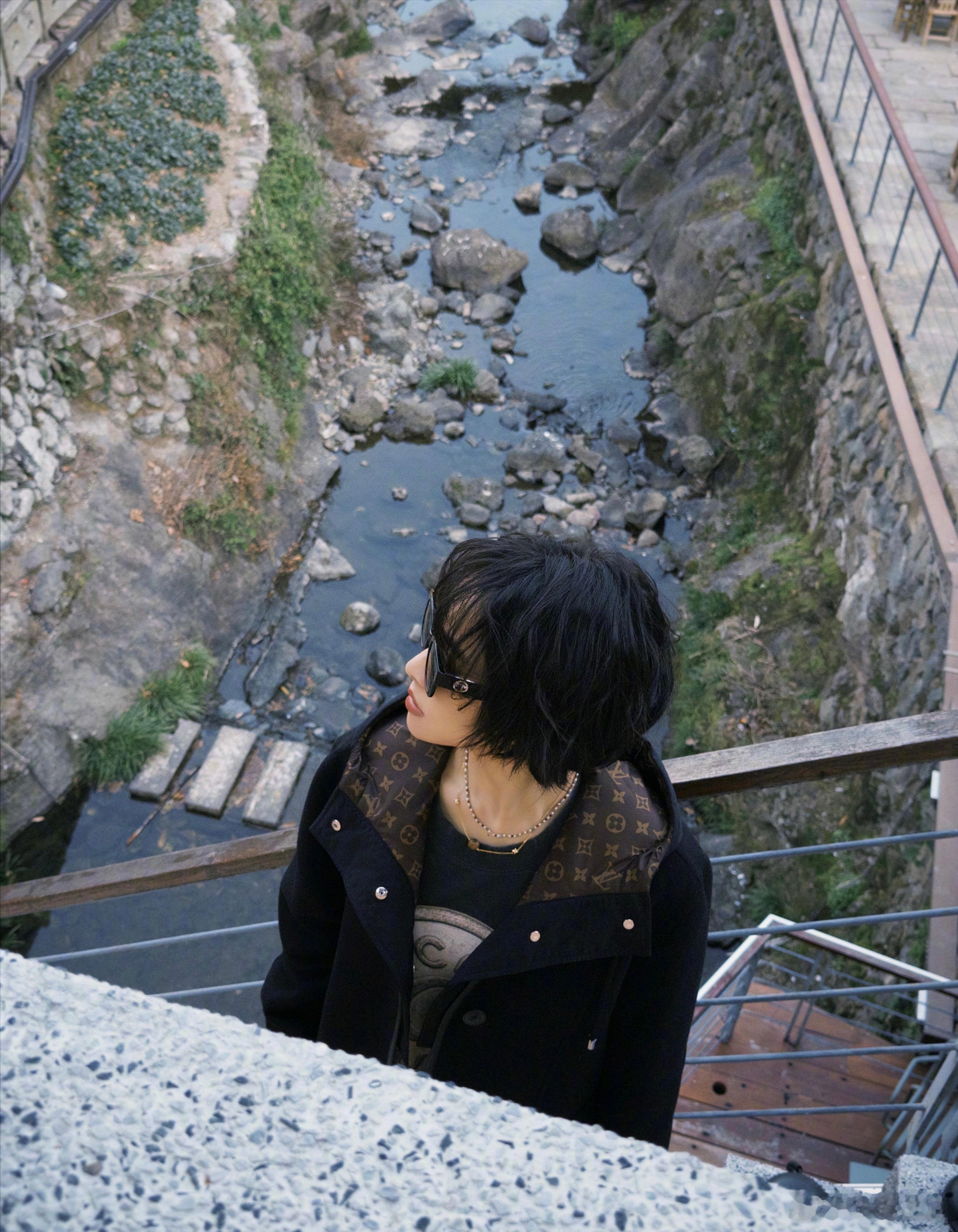 的周末时光穿梭于书店、山野与溪流石阶之间,自在随性。黑色外套与短发造型干练利落,
