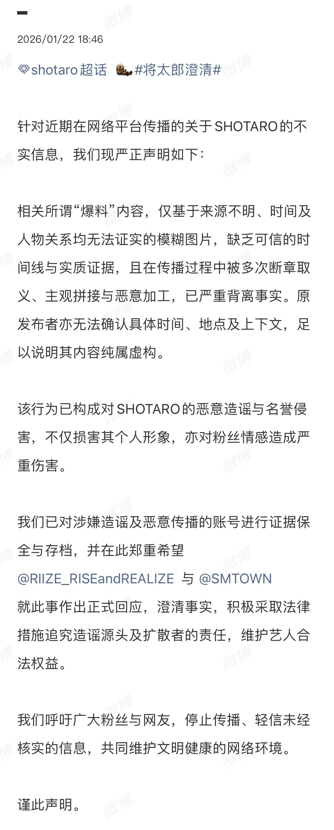 吉赛尔将太郎大吧发声明 吉赛尔、将太郎大吧发声明:希望公司对不实信息明确回应,追究造谣源头责任,切实保护好艺人。
