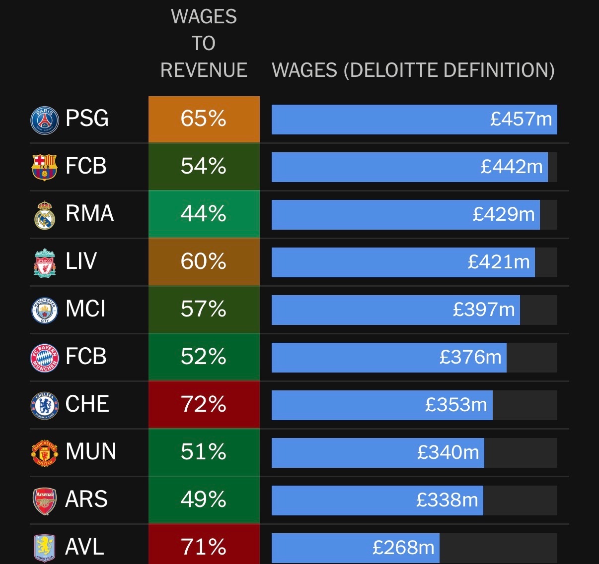 TA:皇马在2024/25赛季拥有世界足坛最高的收入。 皇马上赛季通过商业收入获得了4.99 亿英镑,俱乐部还从电视转播收入中获得了2.81 亿英镑,他们在两项数据上都领先于世界上的所有俱乐部。 皇马上赛季的工资支出为4.29 亿英镑,为世界足坛第三高。然而,该队工资收入占比仅为44%,在工资支出最高的10 支球队中最低。皇马已经连续第三年创下世界足坛最高收入纪录。 halamadrid
