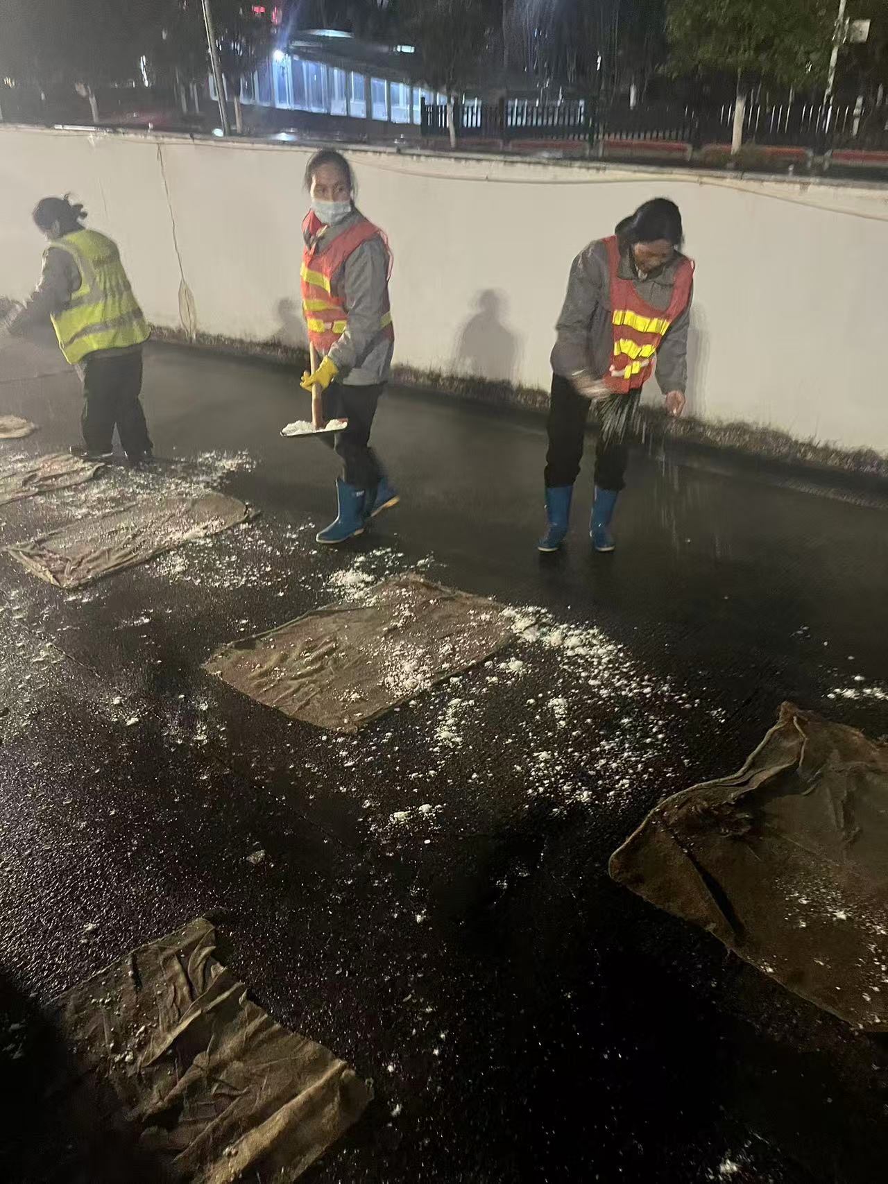 物资保障方面,该公司迅速清点补充物资,在重点区域预先投放融雪剂、防滑麻袋、铁锹等物资,并与供应商确认储备量,确保随时调用。同时,严格遵循冬季作业规定,气温≤5℃时,停止坡道、出入口冲洗洒水作业,清扫道路不喷水,防止路面结冰。