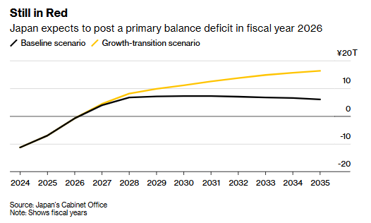 日本内阁府本周四发布的最新中长期经济展望报告显示,在4月起的新财年,不计公共债务付息成本的基本财政收支预计将录得约8000亿日元(约合51亿美元)赤字,占国内生产总值(GDP)的0.1%。尽管这是日本自2001年设立该财政目标以来的最小赤字规模,但政府在去年8月的基准情景测算中,还曾预计该财年将实现3.6万亿日元的财政盈余。
