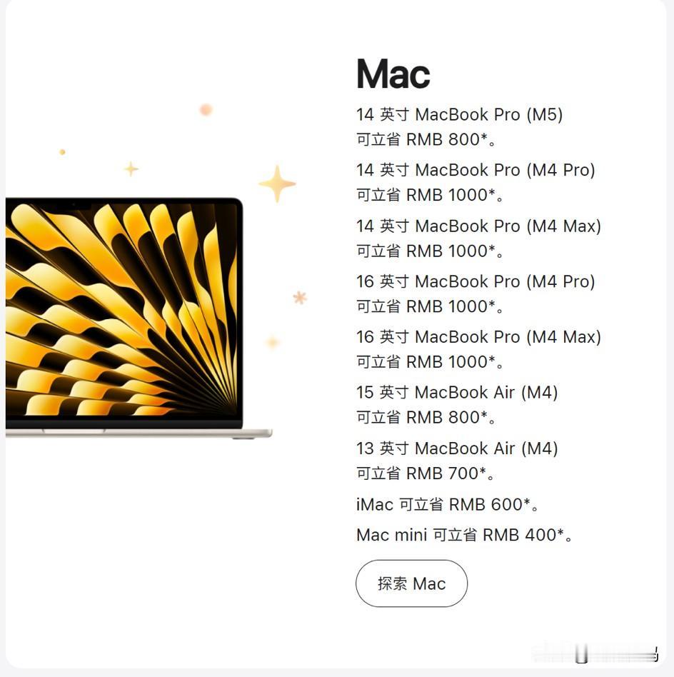好消息! 苹果官网官宣,大陆地区新春活动正式开始,iPhone产品最高可优惠1000元。坏消息!活动只有四天时间,且最新的iPhone全系未参加这次活动,请大家知晓;另外有需要购买iPhone产品的朋友趁着新春活动降价,赶紧去逛逛吧! 下面来看看2026新春活动都有哪些iPhone产品参与活动吧! iPhone: 有iPhone16、iPhone16e,iPhone16plus、三款产品参与活动,最高优惠300元。 iPhone watch: Apple Watch Ultra 3 、Apple Watch Hermes Ultra 3、Apple Watch Series 11、Apple Watch Hermès Series 11、Apple Watch SE 3、5款产品均参与活动,最高可省300元。 AirPods: AirPods Max 、AirPods 4、AirPods 4(支持主动降噪)、3款耳机也参与活动,同样的最高可省300元。 MacBook: 14 MacBook Pro (M4 Pro),购买立省1000元; 14英寸 MacBook Pro (M4 Max),购买立省1000元; 16英寸 MacBook Pro (M4 Pro),购买同样立省1000元; 14英寸 MacBook Pro (M5),购买立省800元; 16英寸 MacBook Pro (M4 Max),购买同样也立省1000元; 15 英寸 MacBook Air (M4,购买可省800元; 13 英寸 MacBook Air (M4)购买可省700元; iMac 购买立省600元; Mac mini 购买也可省400元。 以上这些就是苹果产品就是2026年参与新春降价活动的产品,大家有意向购买的,趁着活动尚未结束,赶紧去薅一单吧!