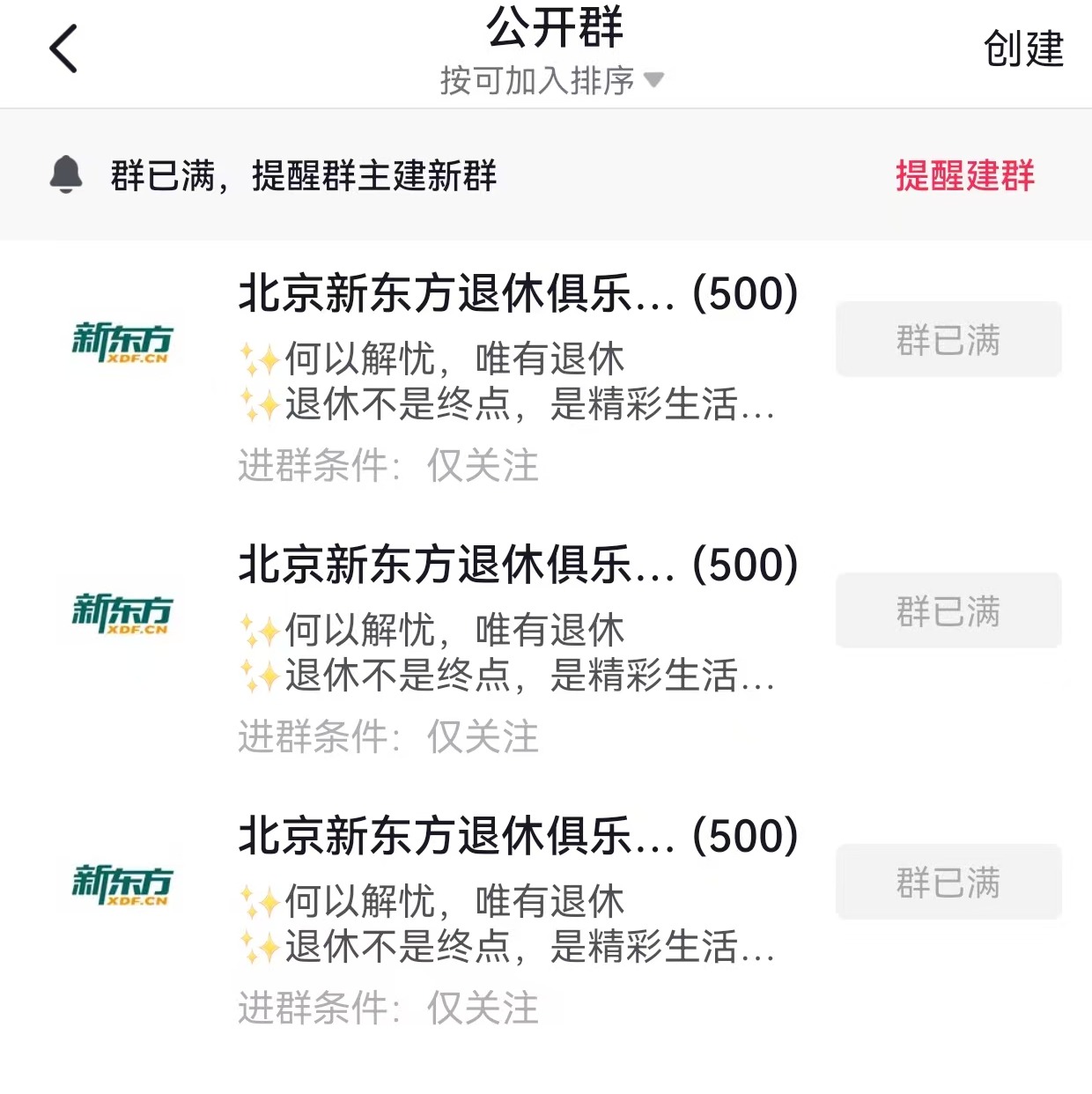 截止发稿前,大河报·豫视频记者申请进入“北京新文旅退休俱乐部”的抖音粉丝群发现,账号仅上线一天,该账号的3个500人粉丝群皆显示“群已满”,而“北京新文旅退休俱乐部”的小红书账号粉丝已有2604个,抖音账号粉丝3239个。