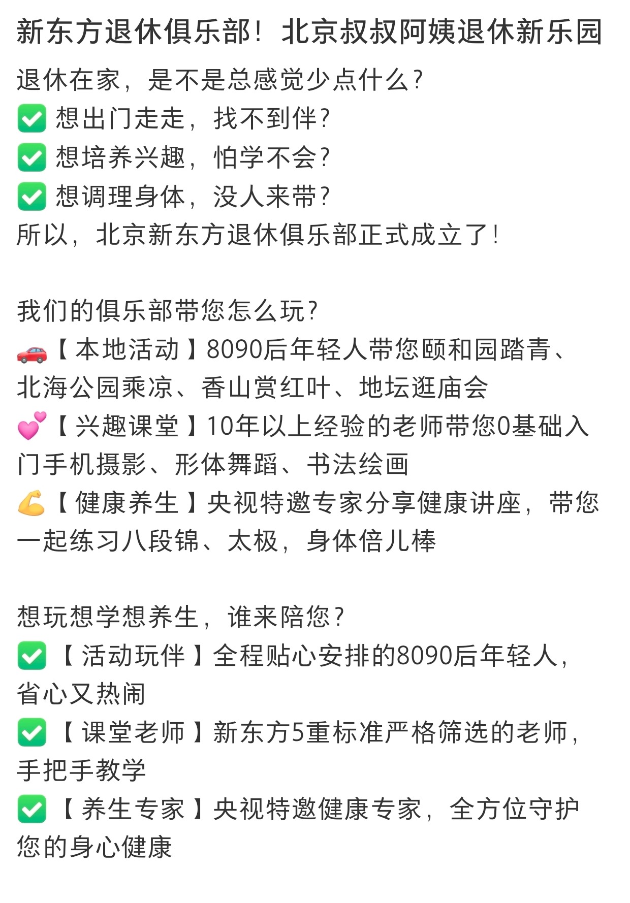 1月21日,“北京新东方退休俱乐部”的账号在抖音、小红书等平台同步上线,其账号首页介绍,该俱乐部是专为50~75岁北京退休人群推出兴趣课程与本地社交活动。