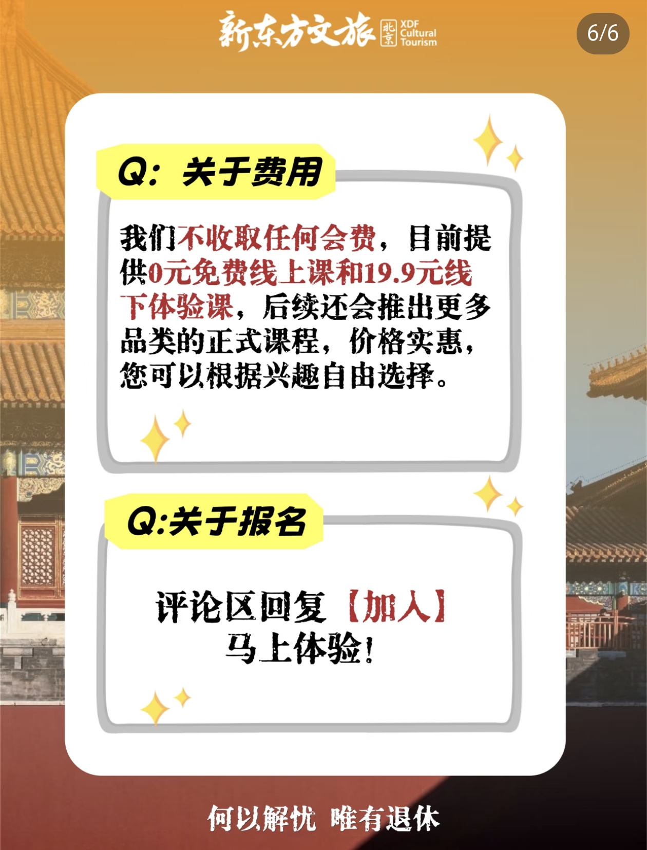 而关于地点和活动的情况,该账号回应,线下体验课将以北京市东城、西城、海淀、朝阳为核心据点,每个城区将设立1-2个新东方校区开课。本地活动也会同步开启,每月举办2场线下小聚会,包含非遗手工、采风摄影、插画茶会等形式。